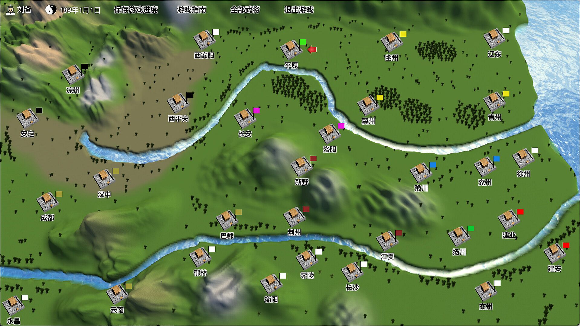 1:玩家选择势力进入游戏主界面,找到对应势力的城池点击即可开始操作管理该城池,别人的城池不能操作,每个势力城池对应颜色不同