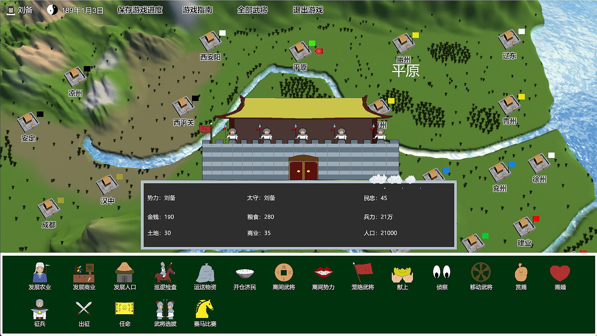本游戏主打休闲娱乐,抛开了传统的内政军事亲历亲为的操作方式,除了君主所在的城池需要玩家自己操作发展,其他城池的内政军事发展该城池的太守会自动模拟发展,战斗也不需要玩家亲自指挥,只需要坐着享受双方战斗带来的沉浸感,完全实现了三国模拟器的开发初衷,一切以模拟为主。