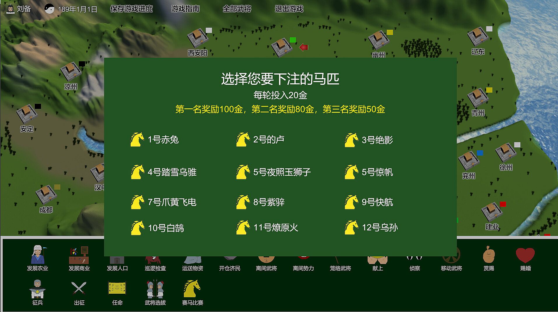 城池发展到一定规模你也不会无事可做,可以欺负欺负小山贼,也可以前往东汉马场猜猜哪匹马儿跑得更快,游戏具有很多未知趣味的小玩法,玩家需要自行触发与发现。