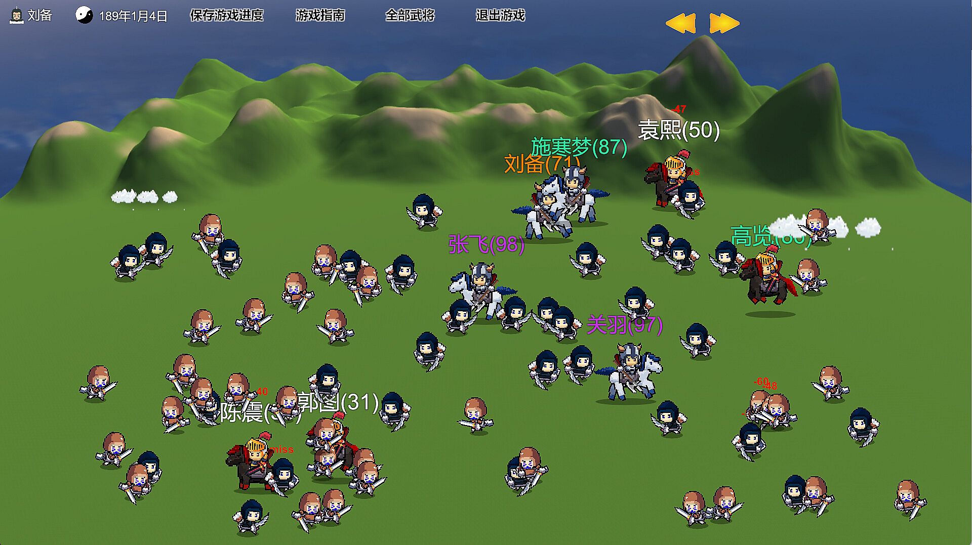 本游戏为即时策略类游戏,其他所有AI势力随时时间进行会自动进行游戏模拟操作,告别传统回合制三国策略模式,玩家需要争分夺秒的和电脑