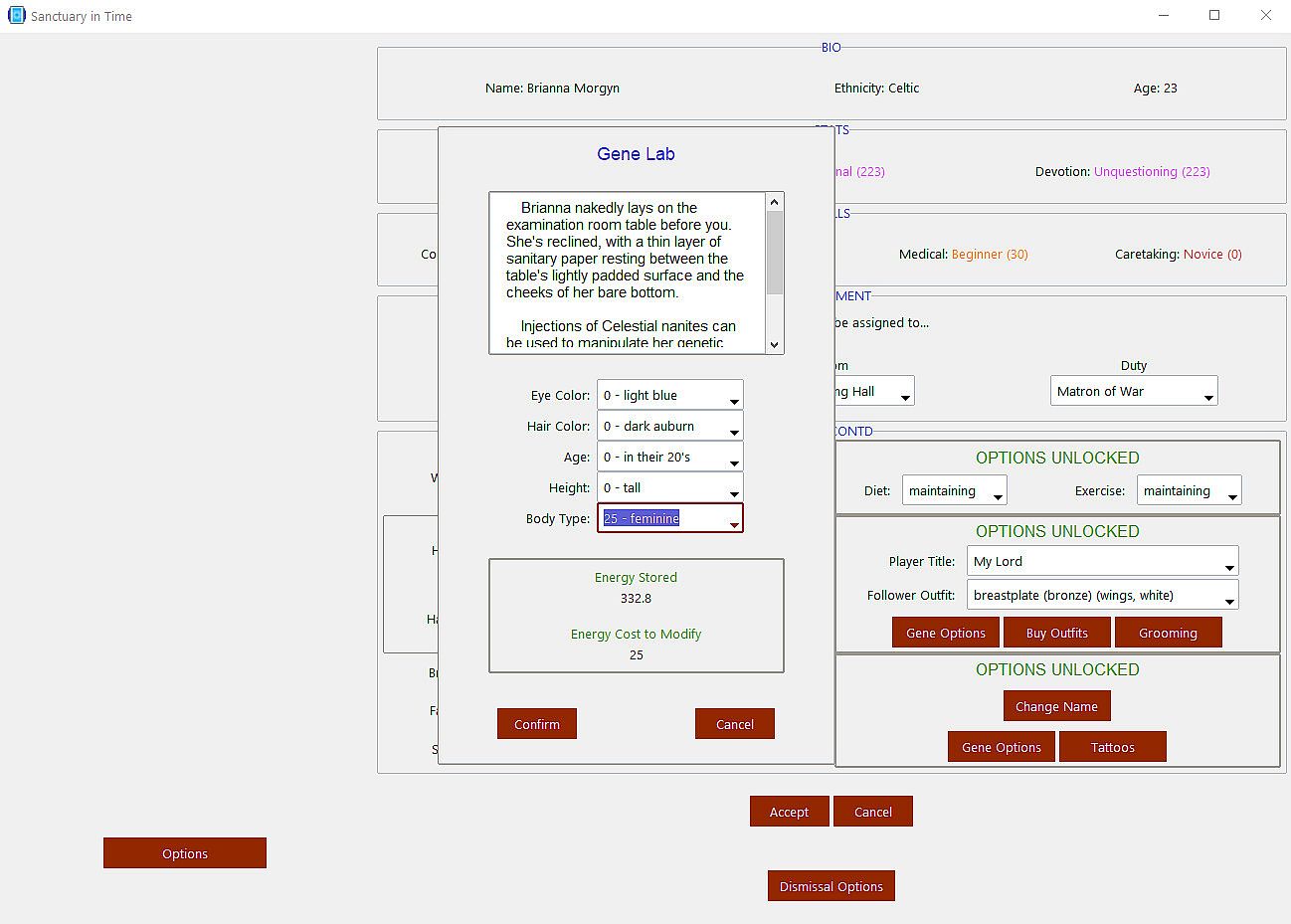 Content: m/f, voyeurism, incest, oral, anal, female masturbation, female muscle growth, genetic manipulation, female body hair, player as god.