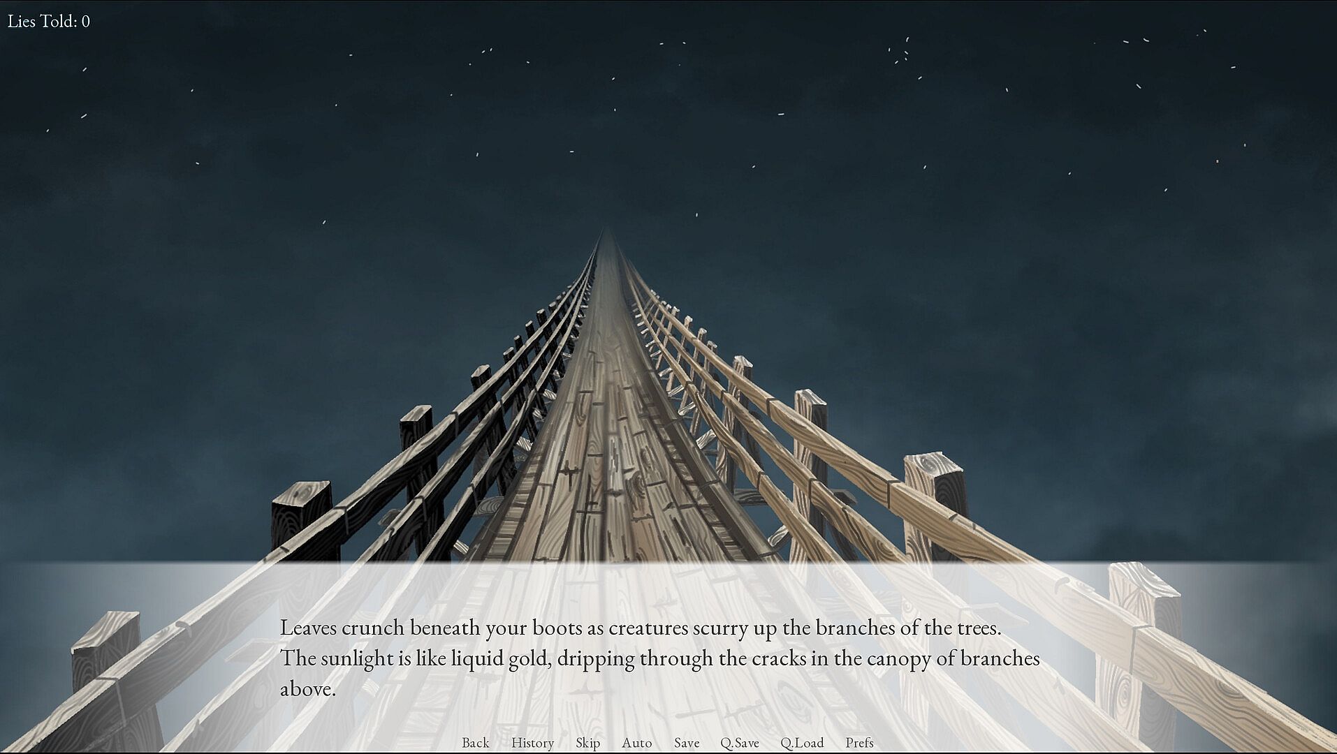 But you? Your body rots as you retain your ability to lie. Flee, little bird, flee to the place they whisper of, before they catch your tongue. That castle across the lake, with the long, long bridge.
