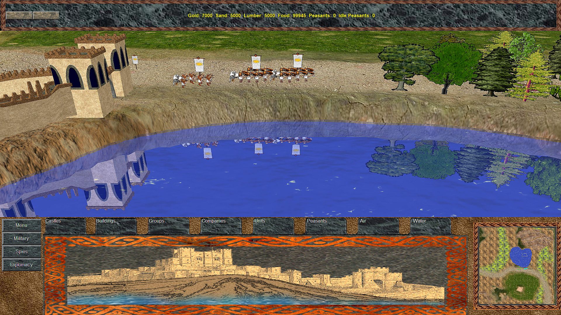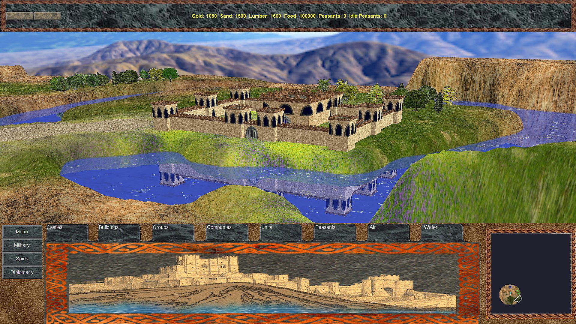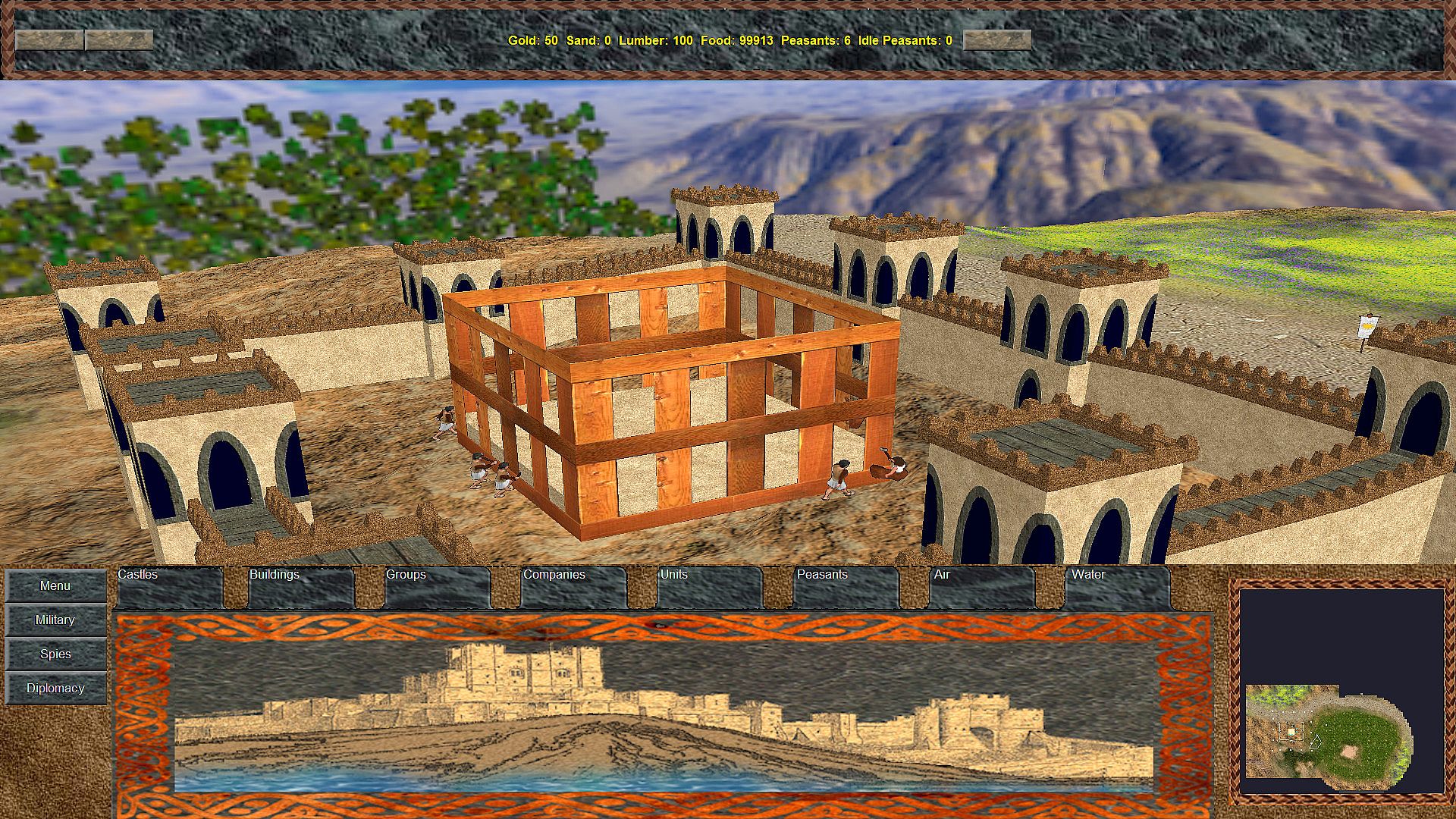 SAND CASTLES is a Kingdom and Castle Building Real-Time Strategy / 4X game with a full 3D Graphics Engine. The game supports up to 6-players (human player or computer Artificial Intelligence). The game features true fog of war within the 3D game world. Your available resources are Gold, Sand, Lumber, and Food.