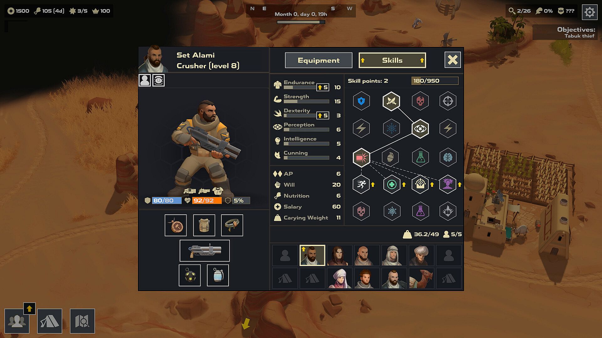Once you engage a group of bandits or sand monsters the game will switch to a tactical map where the actual fighting takes place as detailed turn based combat. Chose skills wizely to outsmart enemies and minimize damage. Your nomads could get scars, grievous wounds or even die after battle.