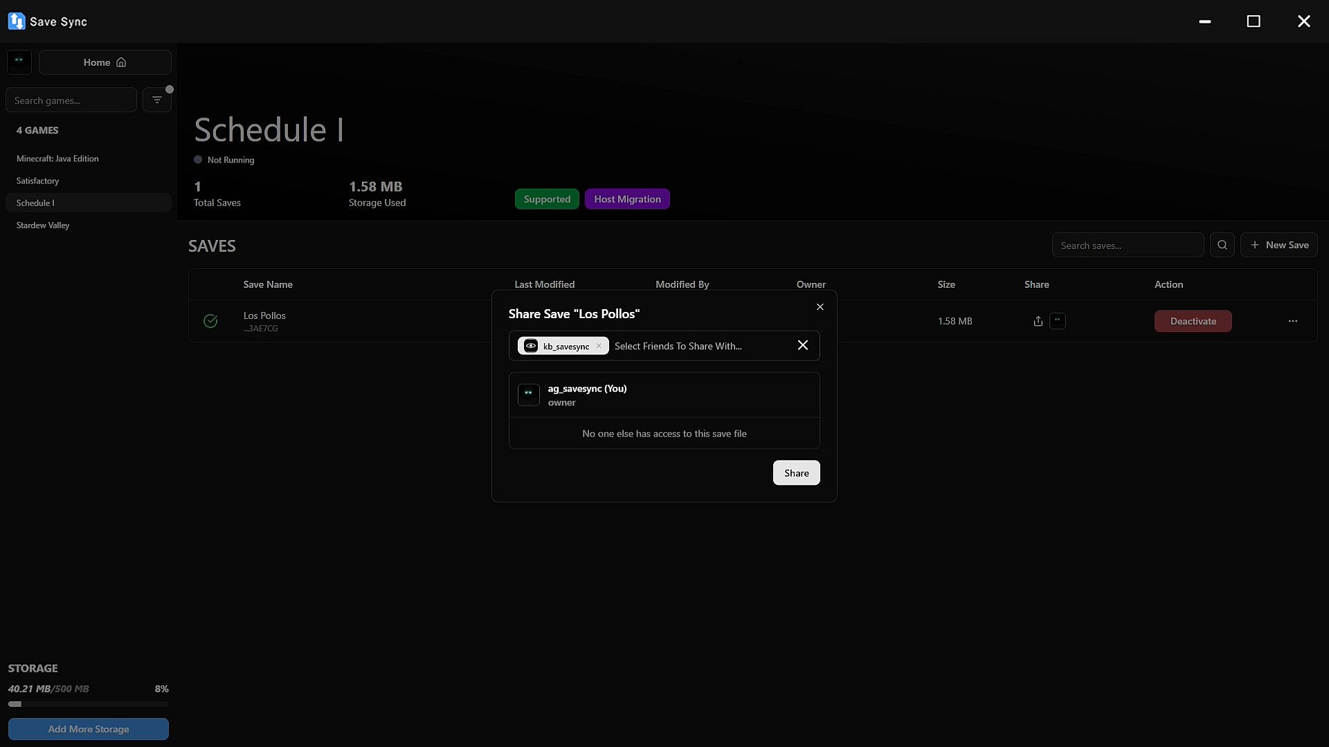 • Cross-User Syncing: Share your save files with friends so anyone can continue hosting.