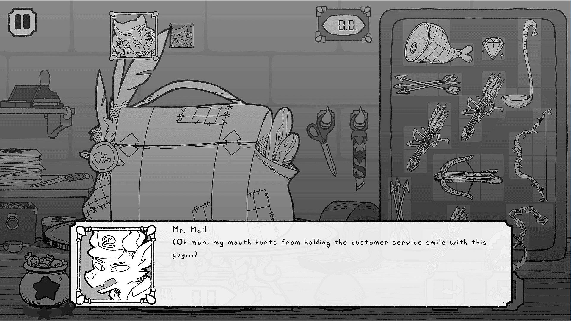 Meet mysterious and charming clients, each with uniquely-shaped bags and quirky sets of items to pack in them.