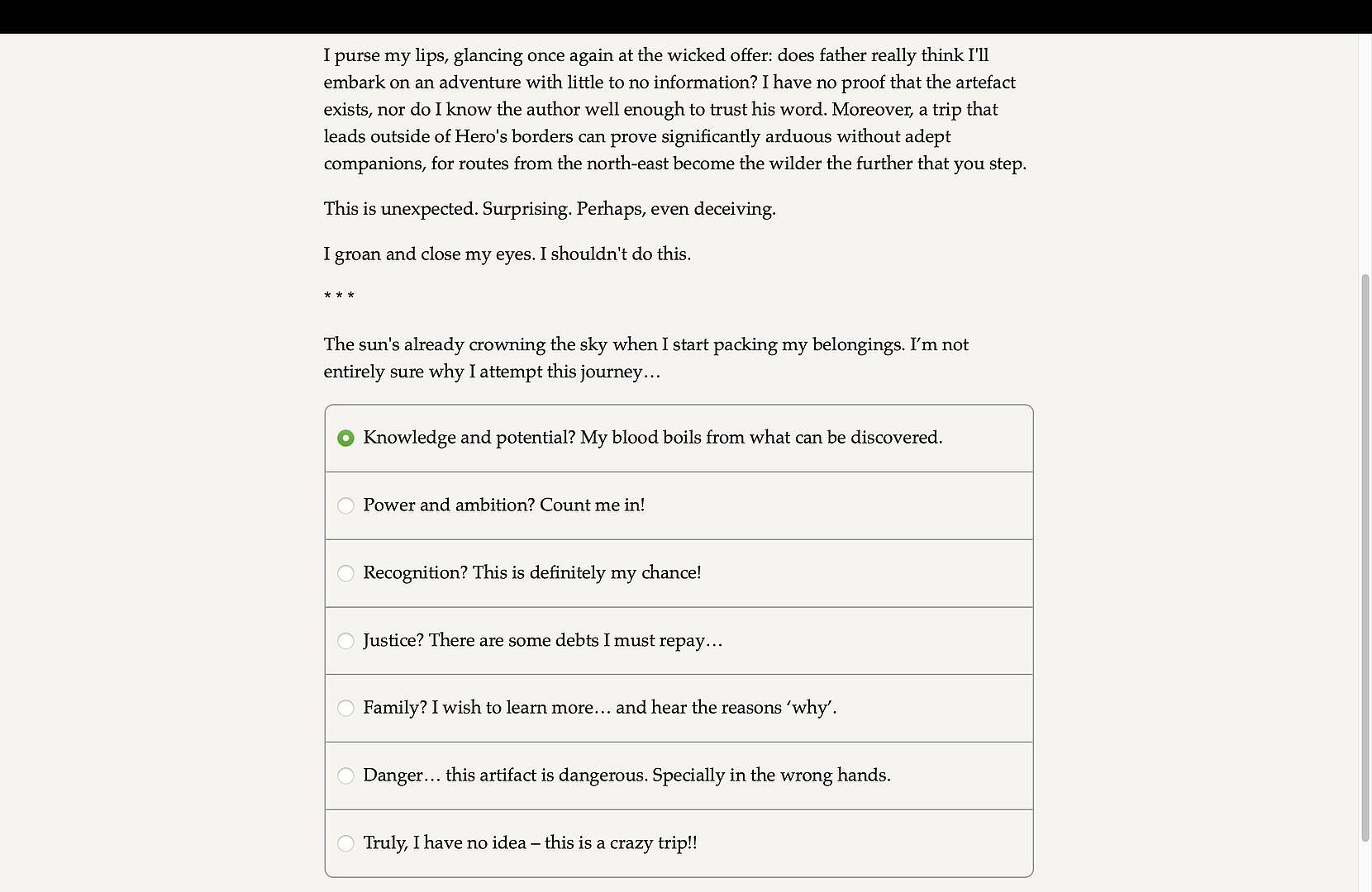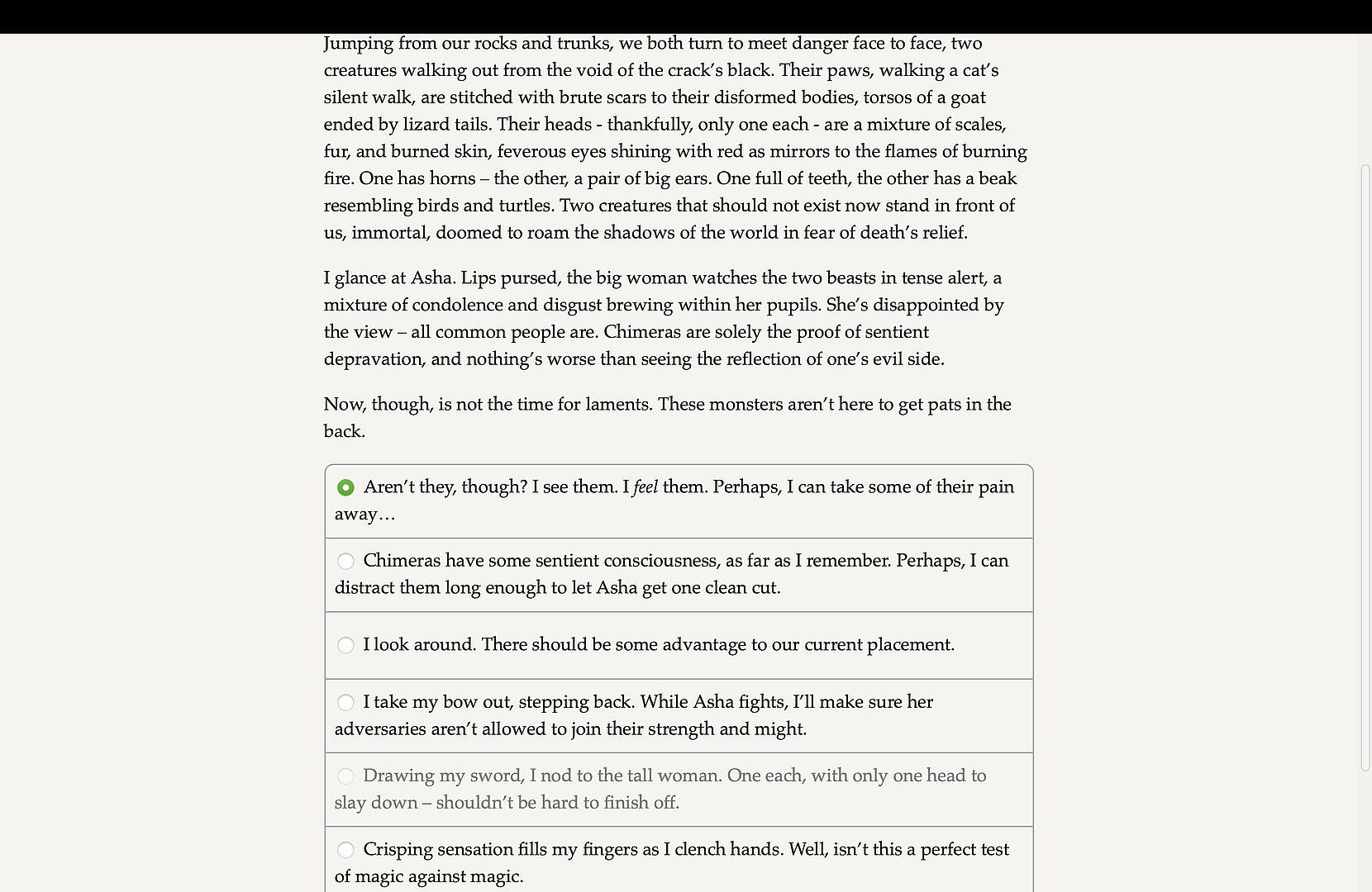 Scales of Justice is a 600,000-word interactive novel, the first volume in a planned series by Julia Owl. It's entirely text-based–without graphics or sound effects–and fueled by the vast, unstoppable power of your imagination.