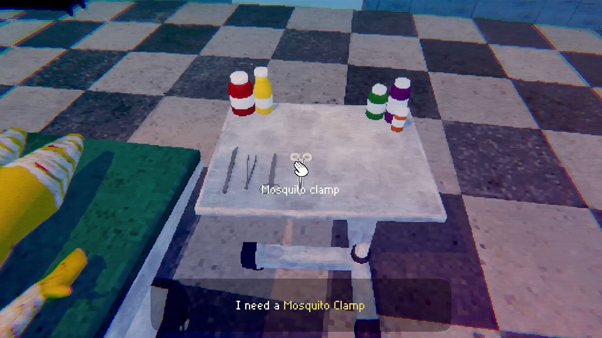 The operating room is as ridiculous as the surgeon himself: a shady blend of surgical theater and cozy living room. Interact with countless objects going from scalpels to record players. Change the music, check the shelves, disinfect tools, or even enjoy a can of orange soda or pop a mystery pill in this curious surgical setup.