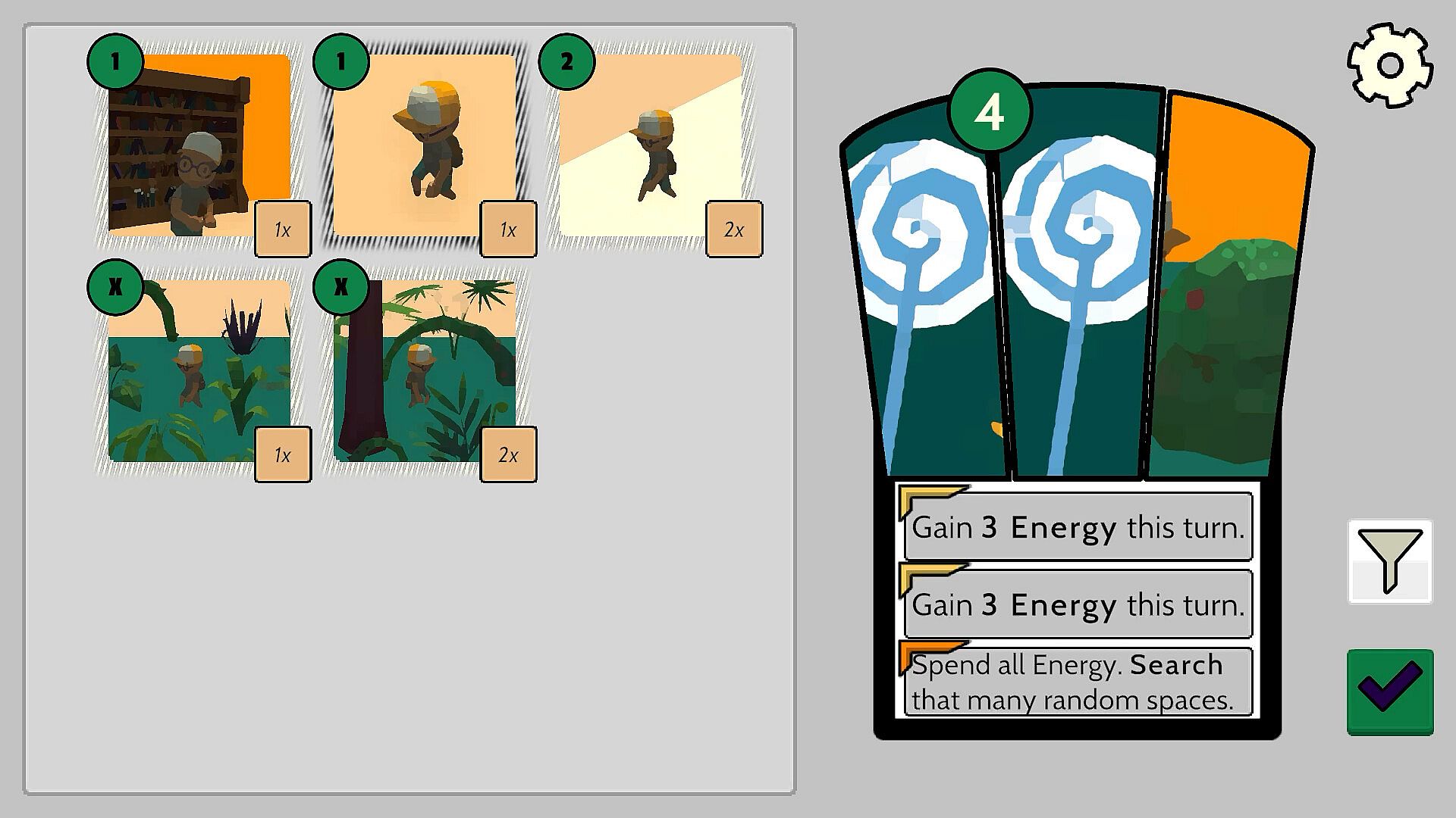 Unlike traditional deck-building games, Scarred Mansion introduces a groundbreaking card crafting system. Rather than adding or removing cards from your deck, you have a fixed set of cards which can be customized using your inventory of different components. Unlock additional card slots and enhance their potency to create a powerful customized deck!