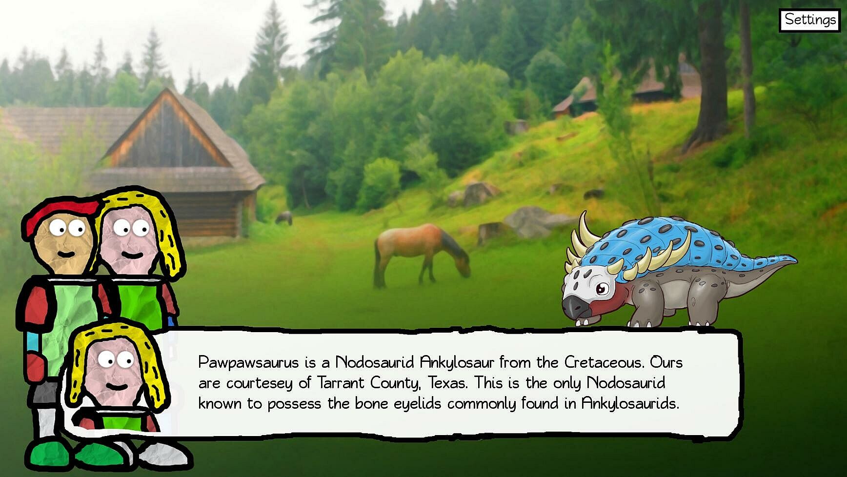 Not really, but go with it. Journey with Poe and Imogen, two reluctant Dinosaur Farmers, as their quiet corner of the world is thrust into the heart of the American Revolution! Now, they must brave the bullets and cannons and try to find peace in a world gone mad. You'll go from scenic winter cabins to tropical rainforest in an effort to win the war, because that's the only way you know how to get away from the war!
