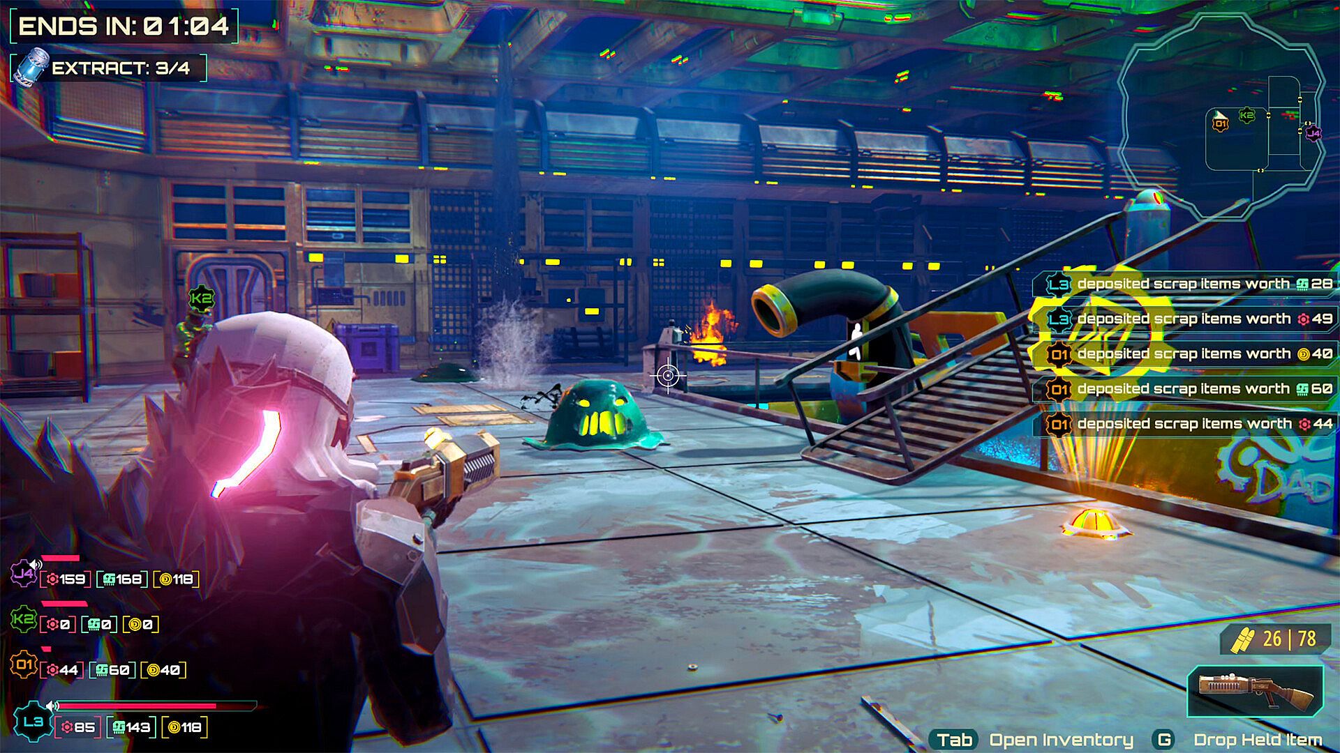 Scrappers do better when they stick together. Every raid throws chaos at you - roaring fires, toxic slimes, tentacle creatures, jammed doors, collapsing hallways, and more. The right tools make all the difference. Want to keep the flames under control? Bring a sprayer. Prefer patching up damage as the base tears itself apart? Grab the repair tool. Whatever’s waiting inside, teamwork and preparation are the keys to getting out in one piece.