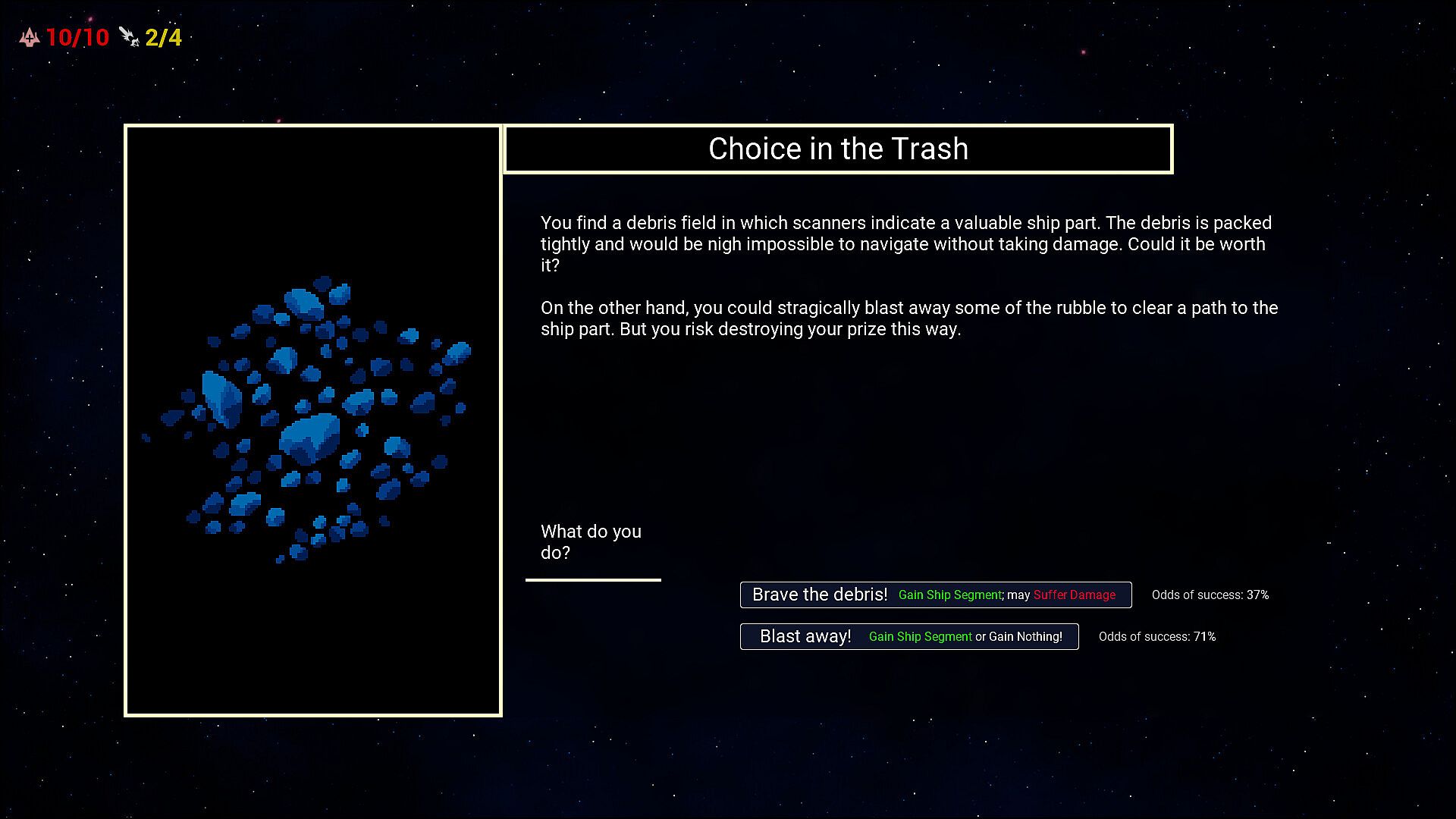 In Scrapchasers, players travel the stars in search of a new star to call home, but they will need more than just their wits to succeed. They will need tenacity, struggling against overwhelming odds to obtain the means for their survival. Ships can be lost, but no attempt is in vain, as the massive colony ship continues its journey undeterred.