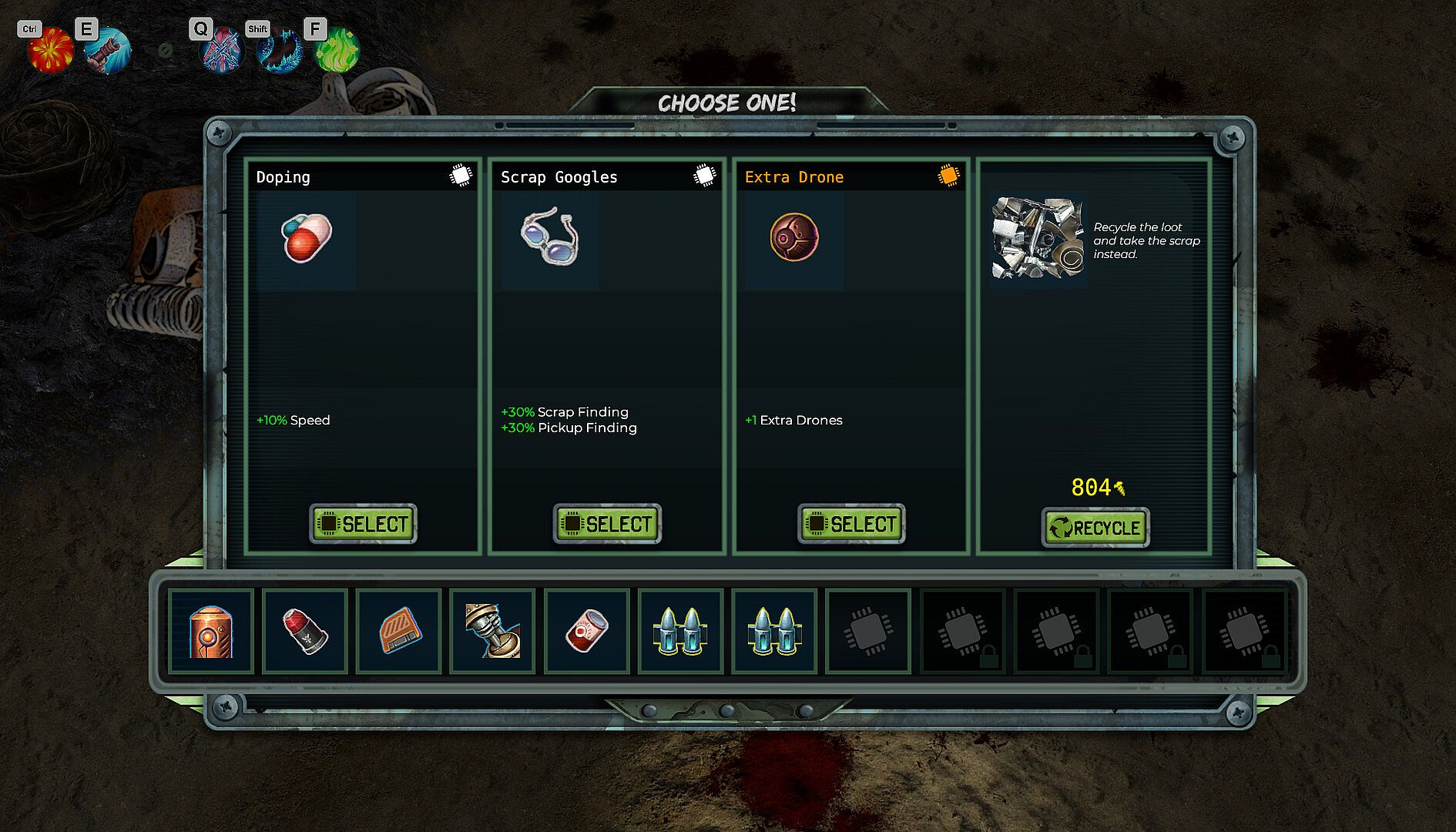 Collect scrap to buy or upgrade items or body parts between the levels