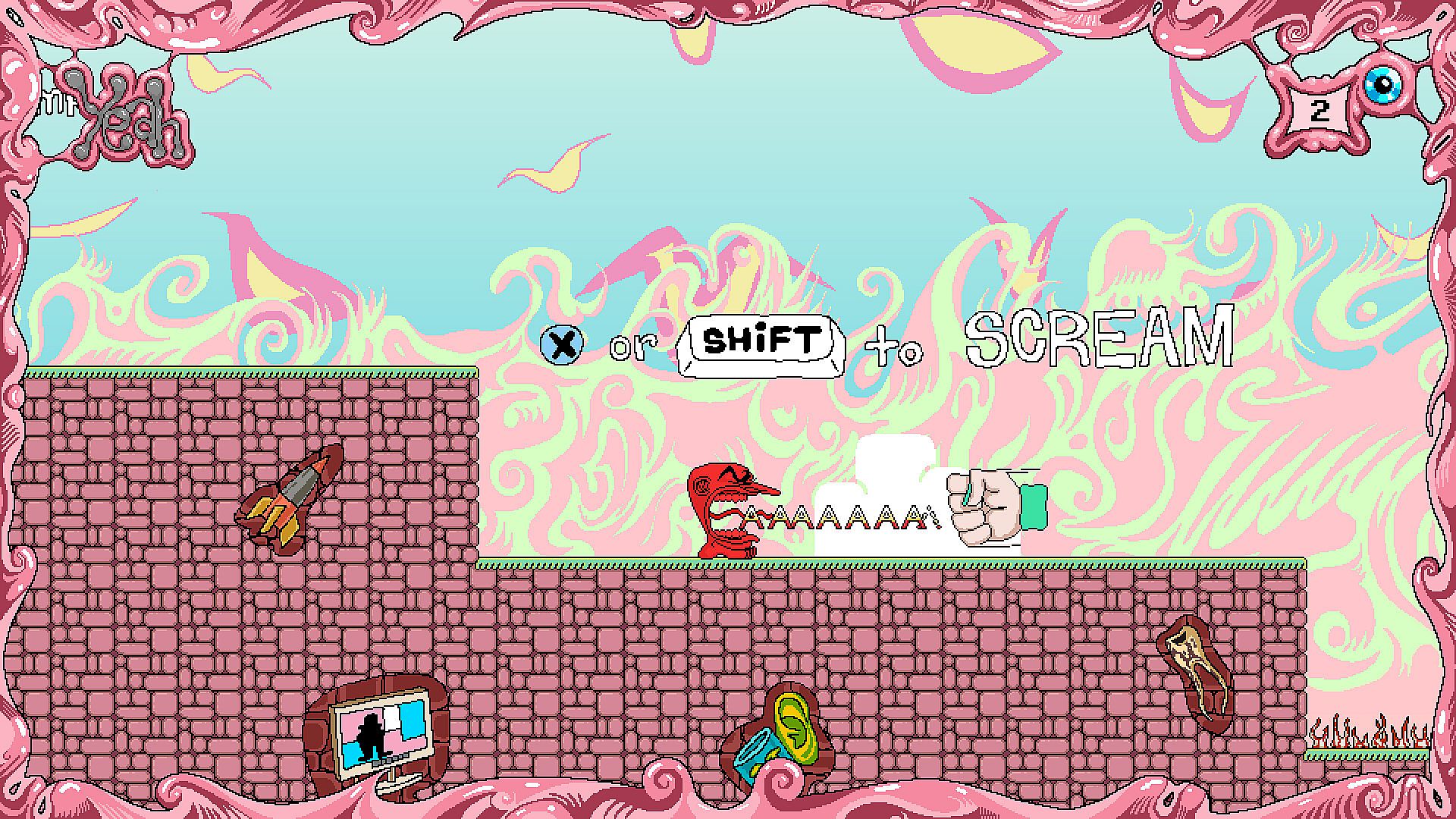 Screaming head is a DIFFICULT 2d platformer. You WILL rage, you WILL suffer and you WILL bite your gamepad as you traverse across 6 different zones as a polyamorous head that pushes his enemies away by SCREAMING AT THEM!!!