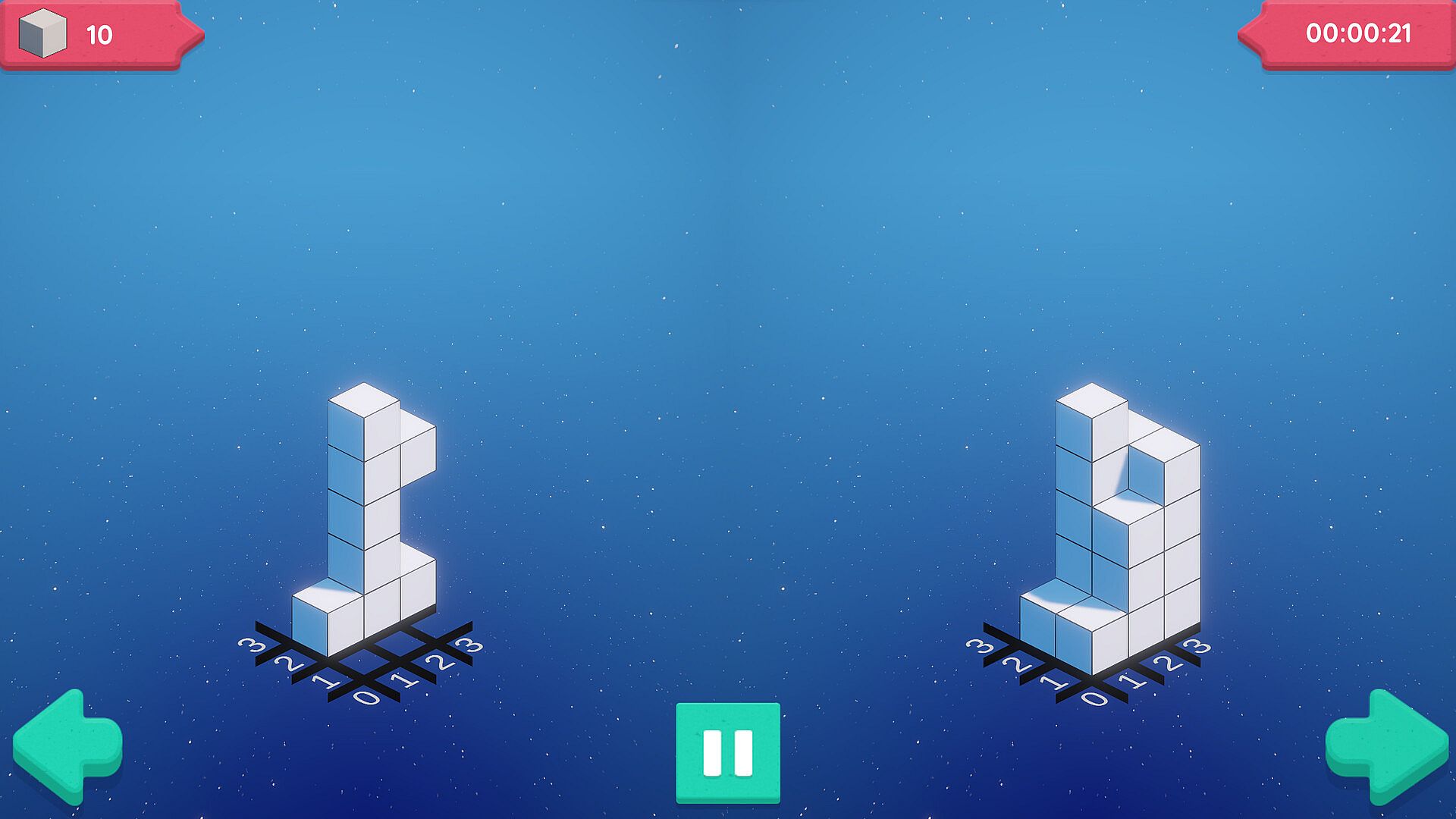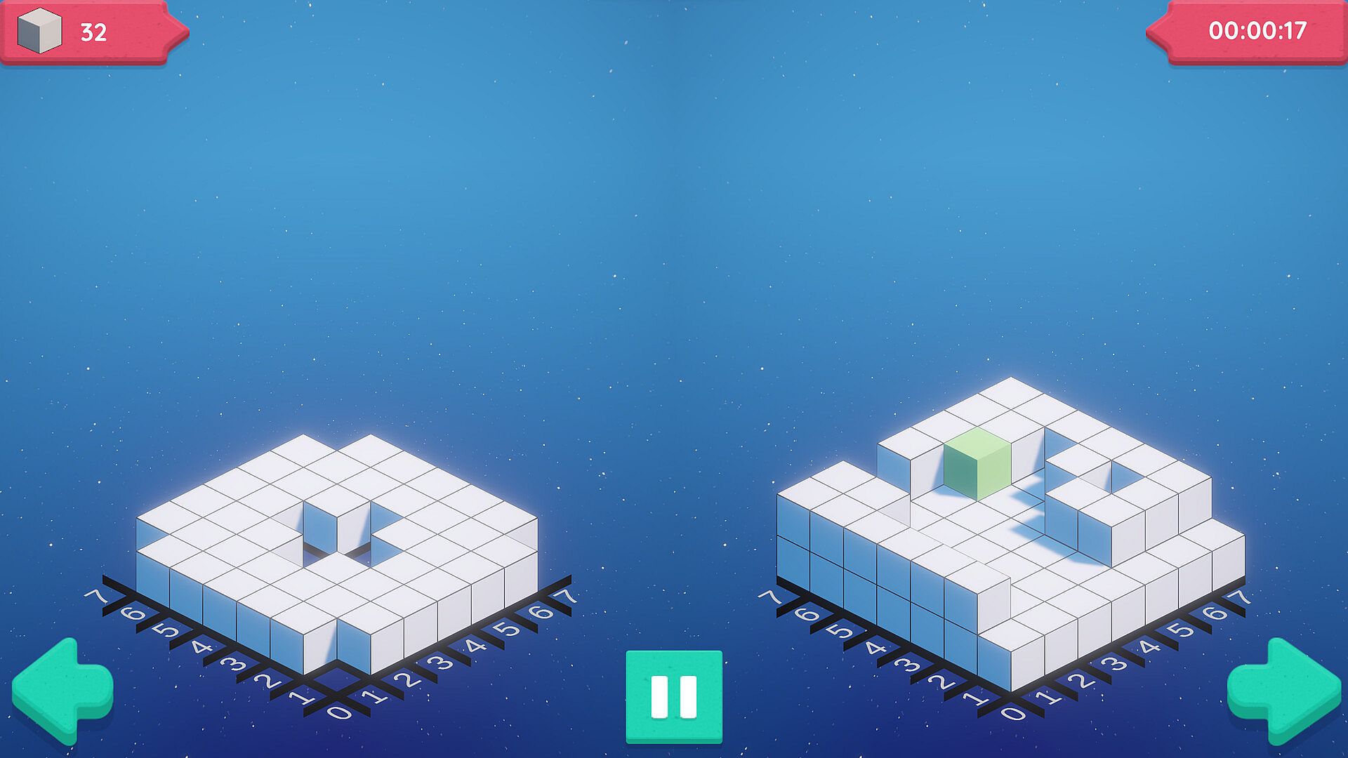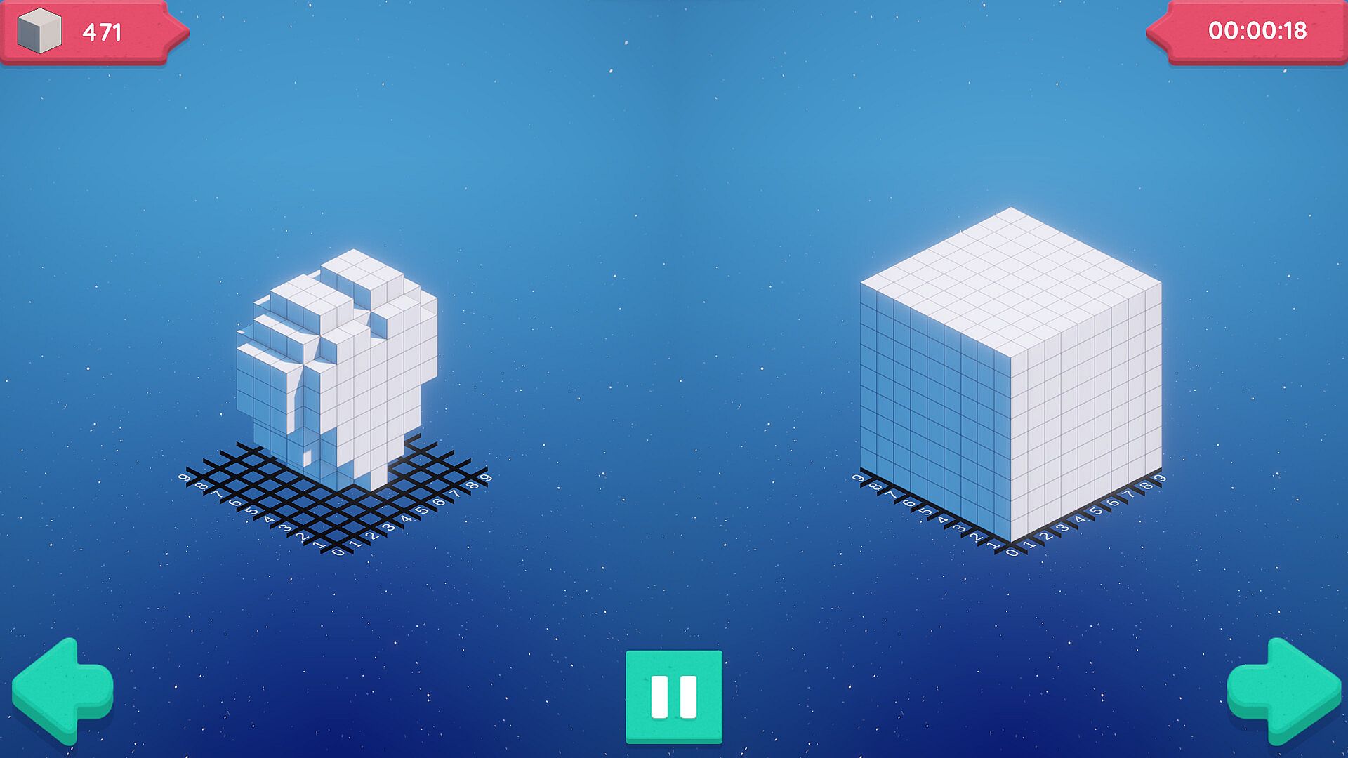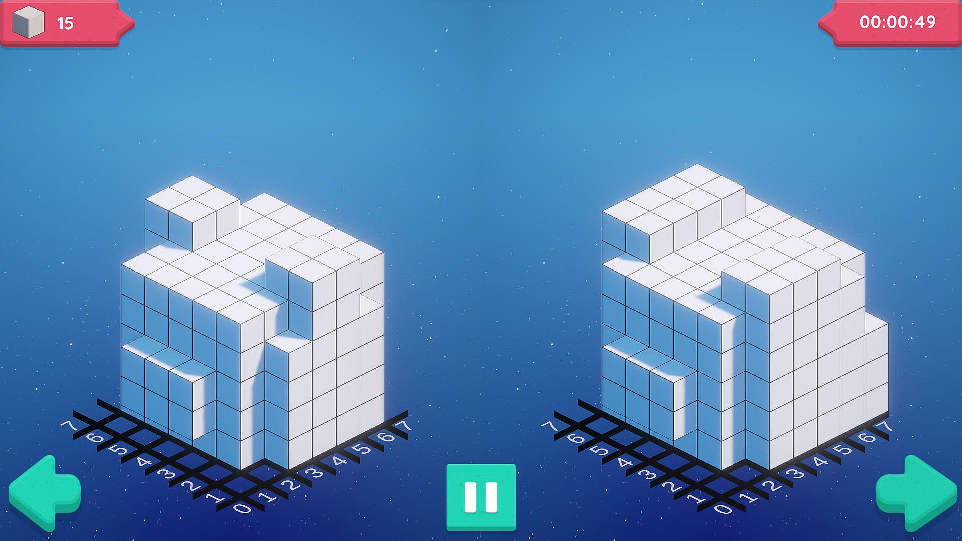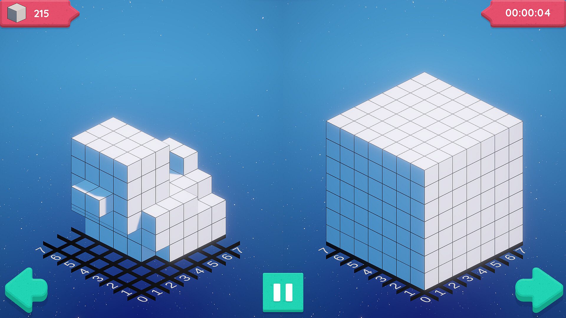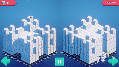 'Sculpt' comprises 30+ meticulously crafted puzzles in a 3D grid-based game solvable through logic. When sculpting, focus on your left; carve outward on your side of the screen. It starts easy but gets tougher as you progress. Make a duck or sculpt out a castle. Some levels feature bomb blocks for faster progress but come with the risk of ruining your sculpt. Or demonstrate your mastery by completing each sculpture within a time limit.