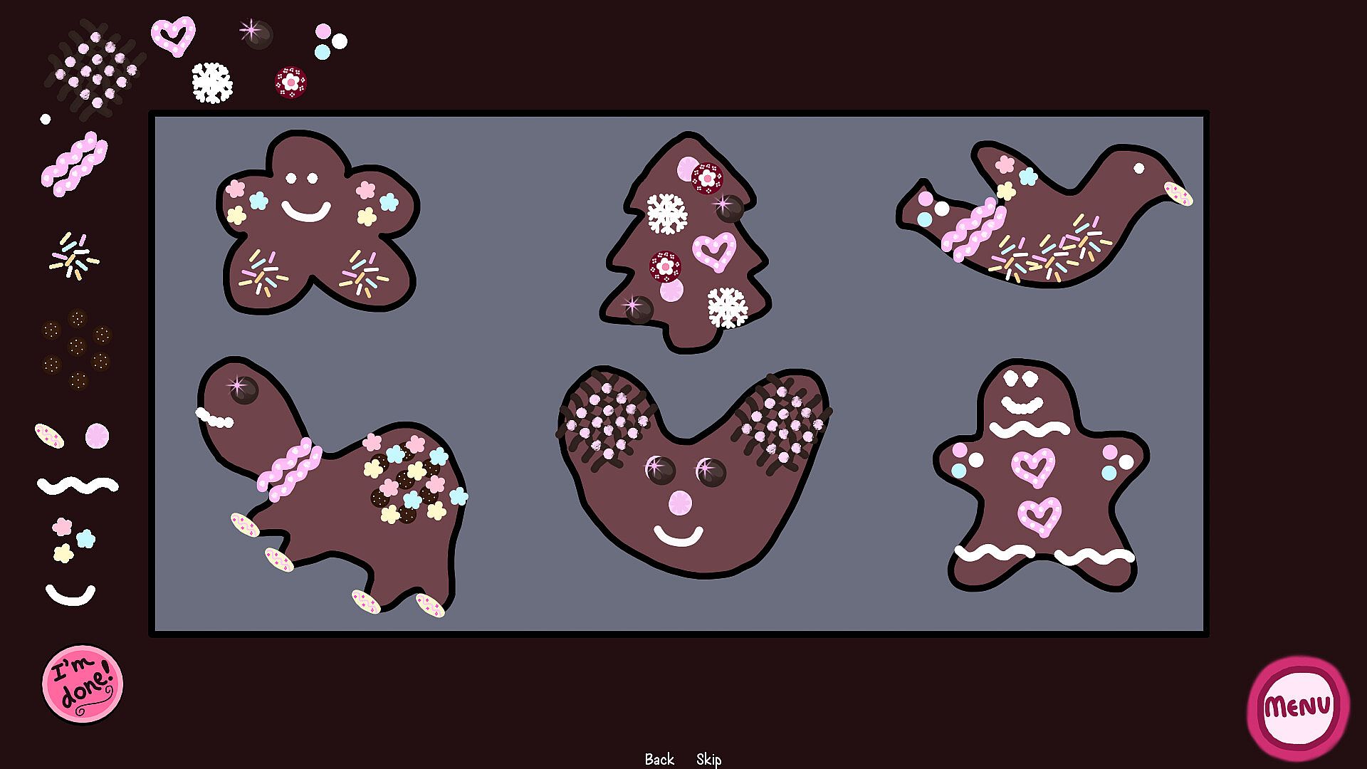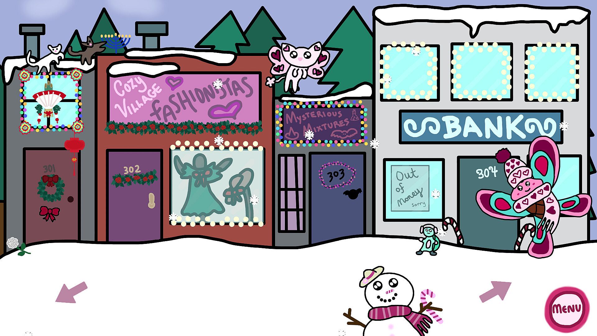 The holiday festival kicks off in Cozy Village. Players meet friendly town residents, lend a hand with event preparations, and pick up a gift for Chippy's mom through holiday shopping. They hunt for cats, hang up decor, browse shop windows, and decorate cookies in this point & click indie game.