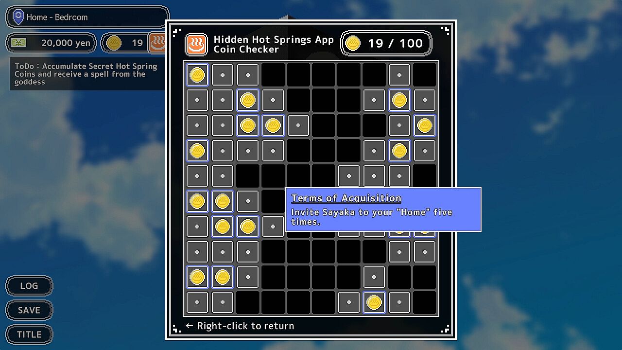 Gather faith for the goddess of hot springs by enjoying the bathing facilities together with Sayaka. Faith can be earned in multiple ways: Soak in one of the hot springs, indulge in naughty acts or collect hidden Hot Spring Coins. Once you have accumulated enough faith for the goddess, you can receive one of her blessings to unlock new locations, increase your weekly travel budget and more!