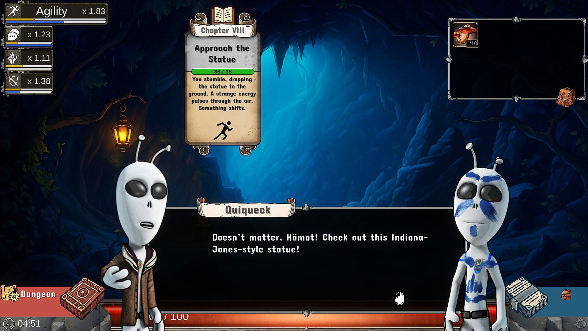 Combat is fully automated and turn-based. Improve your fighting skills and watch as your aliens face rats and other enemies with increasing confidence.