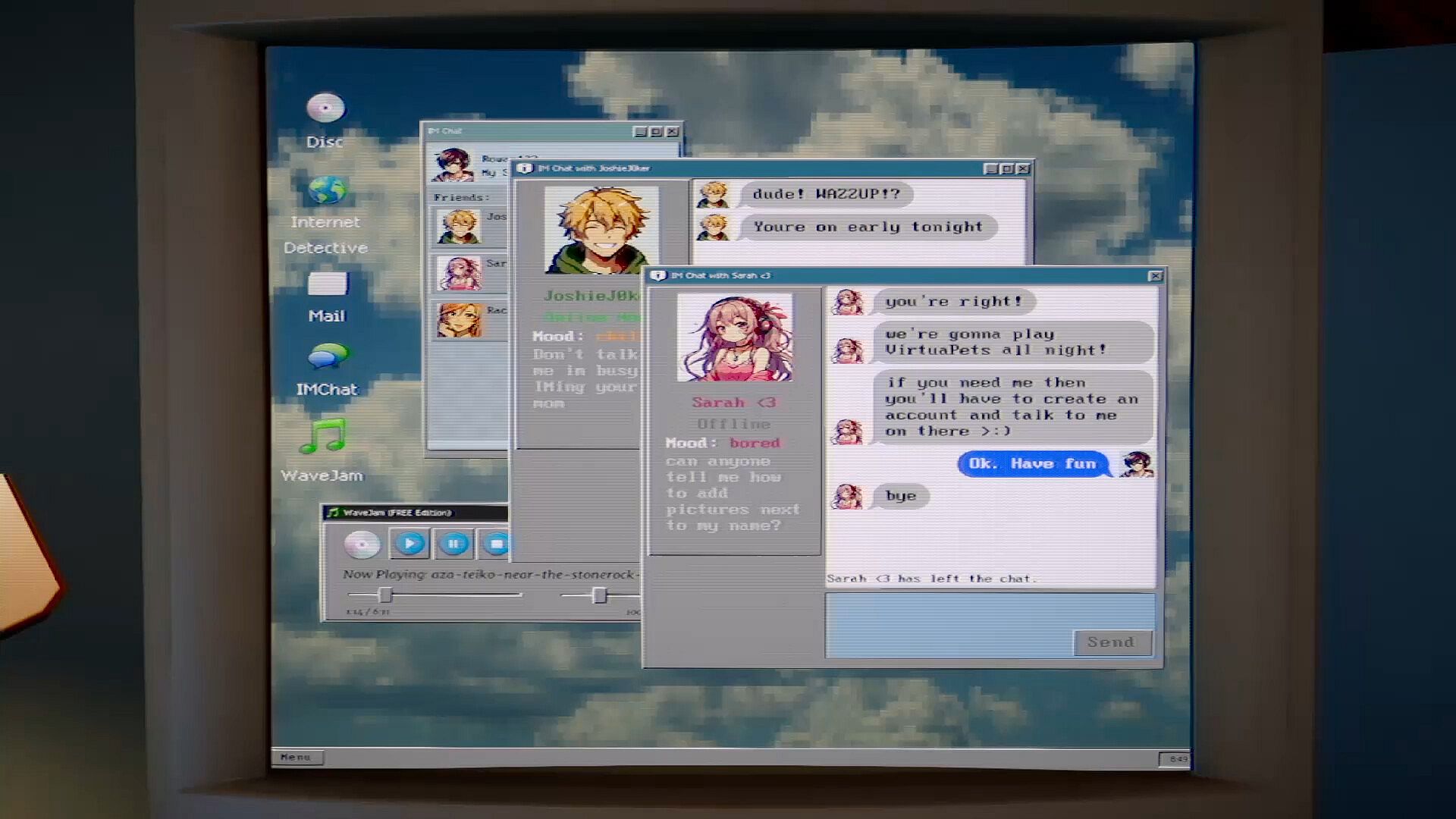 Forget the mystery and play video games. That's right. You aren't in any danger (most likely, anyway). It's Friday night, and there's so much happening! Sarah is playing Virtuapets, Josh is on SwordScape, and you JUST got the GameSphere for your birthday. You can forget all of what's happening and get lost online. Y2K isn't for another 3 years, anyway!