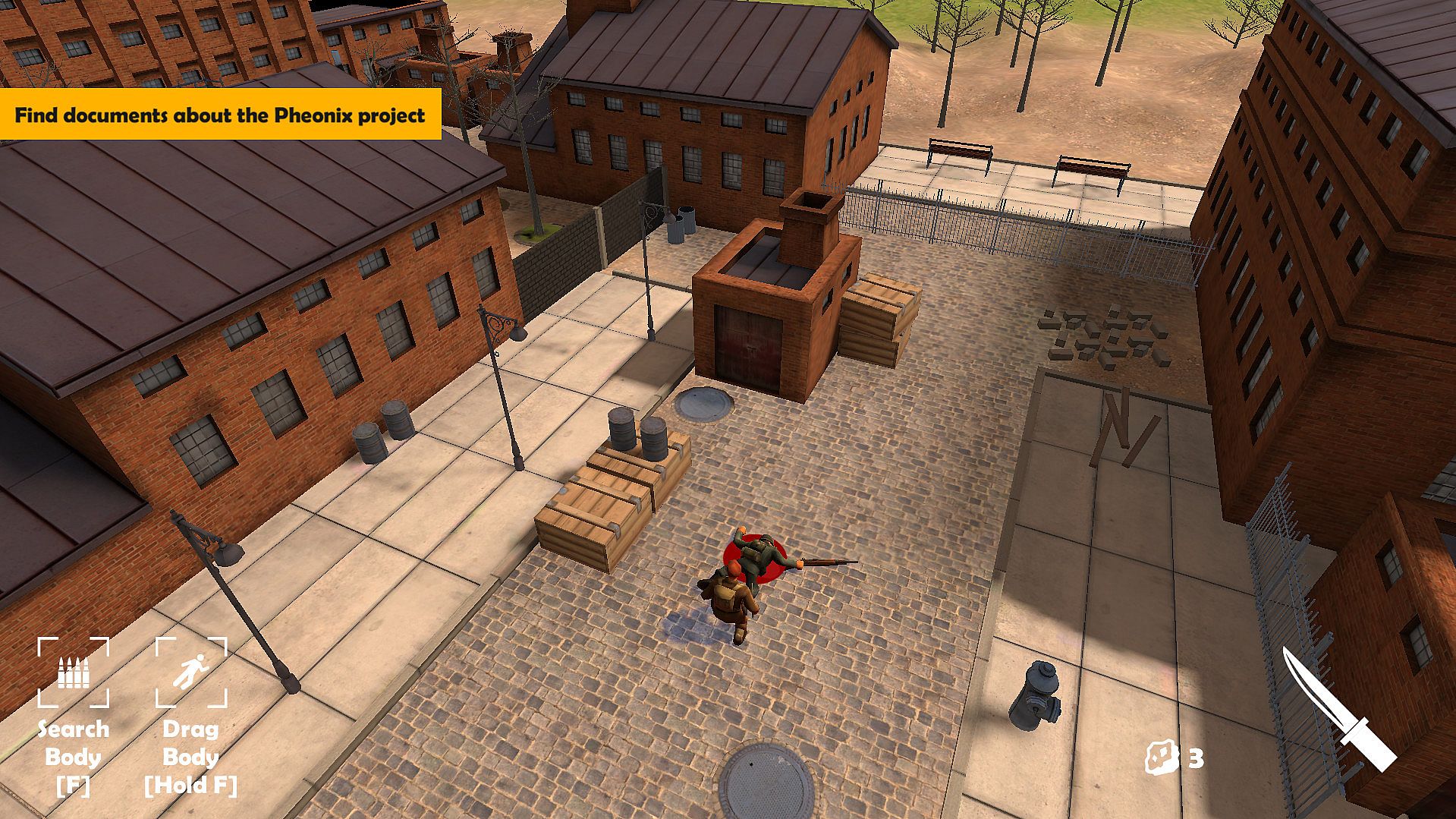 • Drag dead bodies to hide them from enemy sight. If an enemy sees a dead body, he will alert nearby enemies