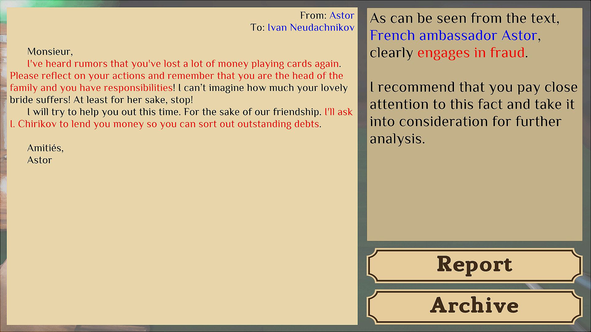 Section Six - is a blend of interactive fiction and simulator. It tells a satirical story about seven days in the life of a postal censor during turbulent times in alternative Russia of the late 19th- early 20th century.