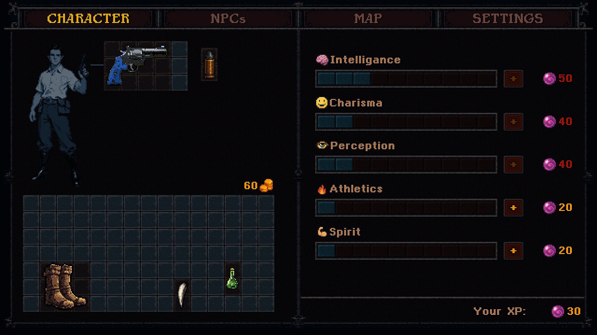 Manage your inventory, level up, trade, search for clues...