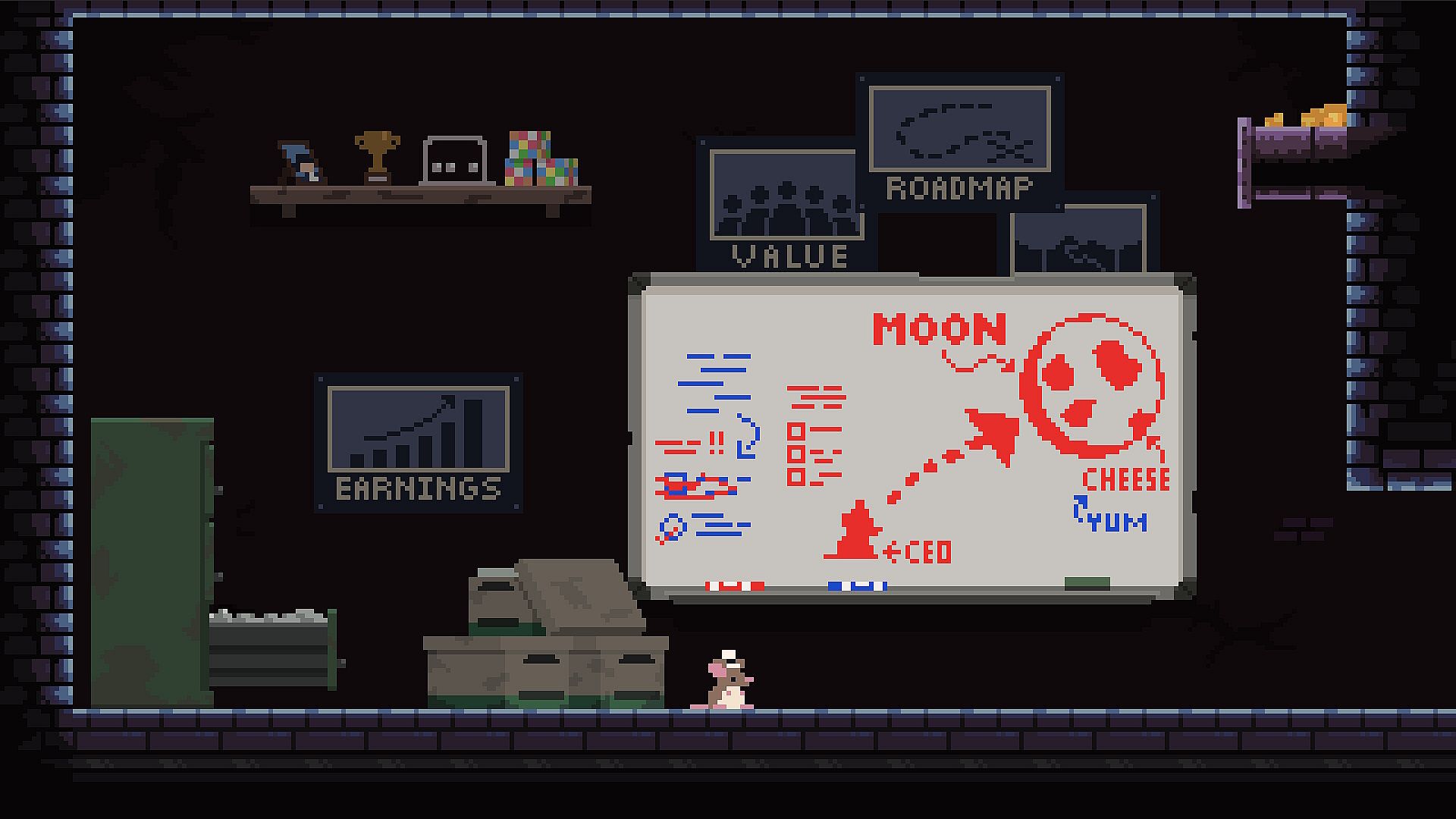 For centuries, mice have pointed their whiskers to the night sky and marveled at “The Big Cheese”. Emulate your human predecessors. Harness the power of explosions to propel yourself skyward and claim the biggest cheese, the Moon.