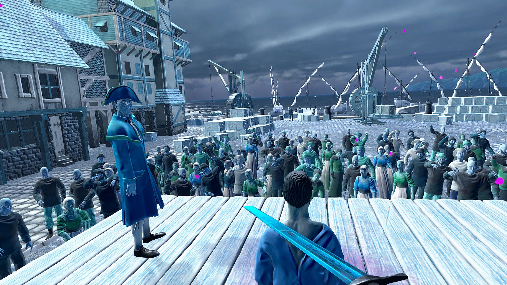 Sentenced was designed for Virtual Reality. Look convicts in eye and physically swing the sword that beheads them. In a traditional game, an act of violence is reduced to a button press, and enemies are often dehumanized. This will not be the case in Sentenced.Narrative