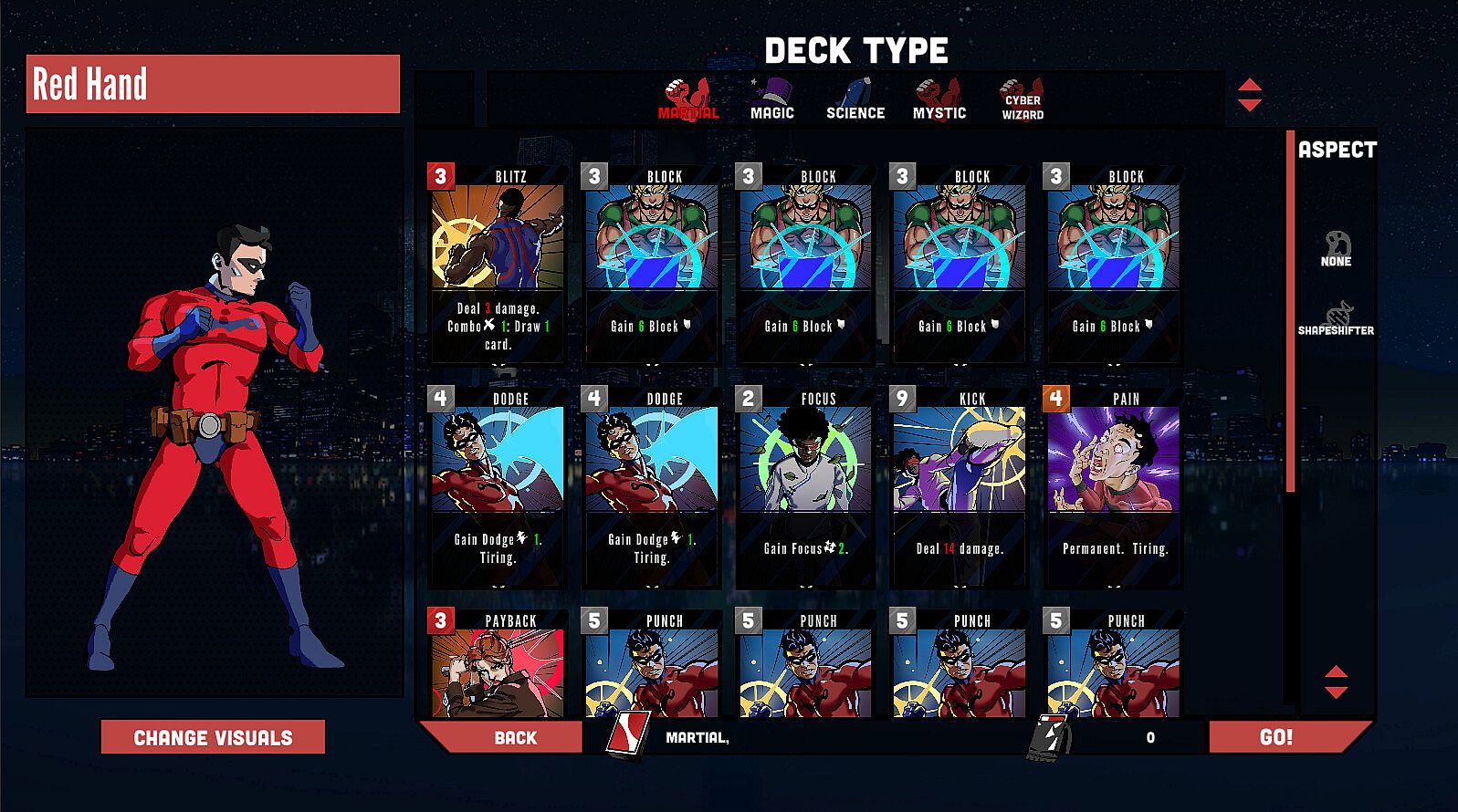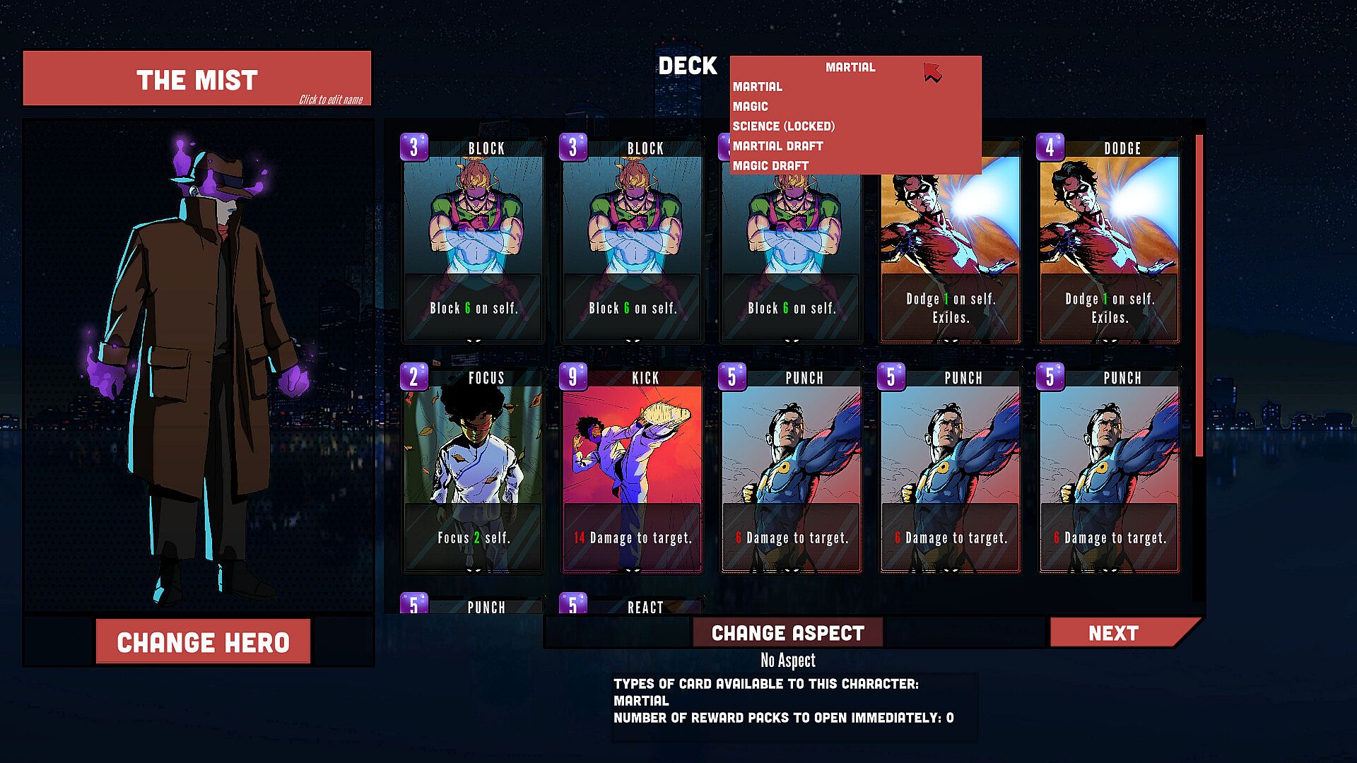 Each run you can choose one or two Archetypes such as Martial, Magic or Science to make the hero you want. You can also add a Aspect which adds extra cards - maybe your Magic User is also a mutant who can shapeshift? Did your Scientist learn how to become a speedster?
