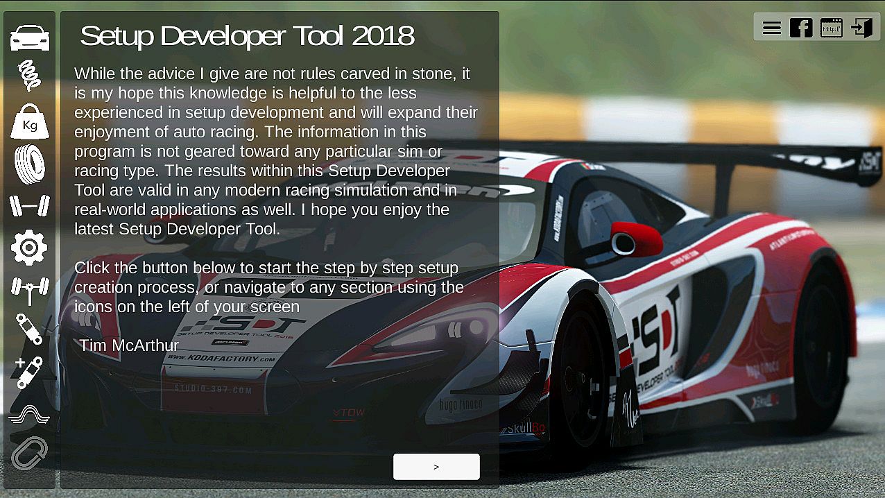 So you know nothing about setting up a race car? Want to build your own setups but don't know where to start or what anything means? The Setup Developer Tool is for you. SDT will walk you through a step by step process of creating and customizing your very own personalized baseline race setup. It does so by asking simple questions about the car type, track type, and behavior of the car on track. Choosing from a menu of possible responses to the questions, the user describes the car and SDT offers valid setup changes for each step in the process, ultimately resulting in a user-created baseline setup personalized to your own needs.Product features