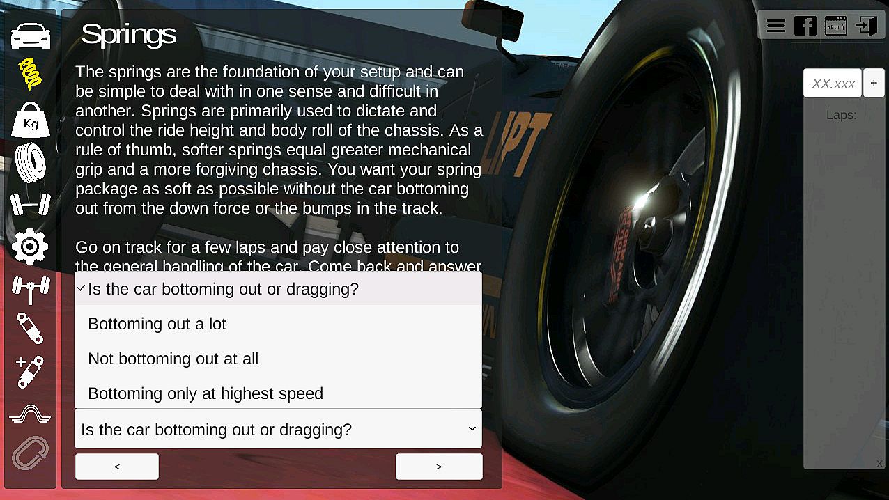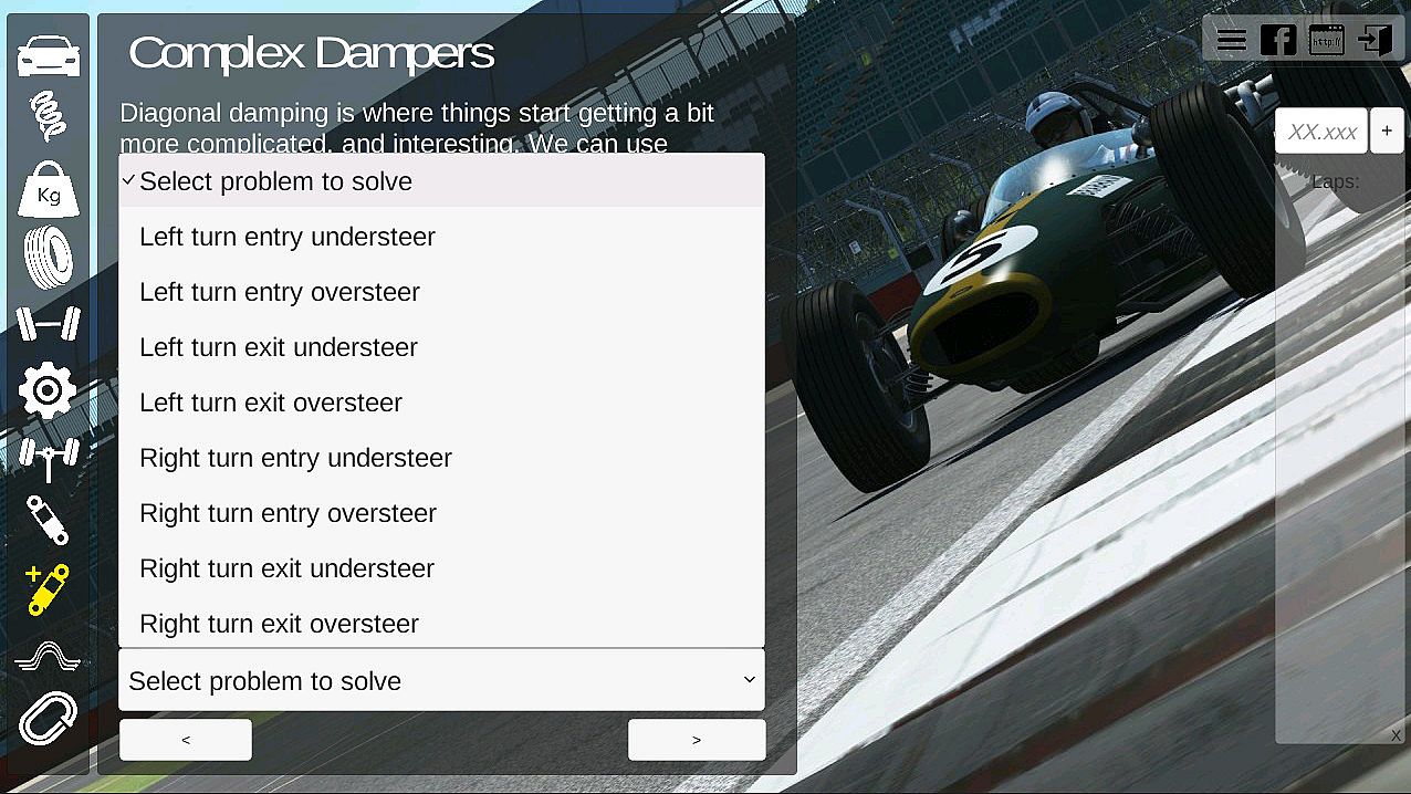 The Setup Developer Tool is the product of more than two decades of research in auto racing and race car setup mechanics. The information offered therein is relevant not only to all racing games, but real world applications as well. It can be used with any realistic auto racing software that allows the users to adjust the car setup, including the following: Assetto Corsa, Automobilista, Codemaster F1 series, iRacing, Project Cars, RaceRoom, rFactor, rFactor 2, Stock Car Extreme, Forza, Gran Turismo, and more.
