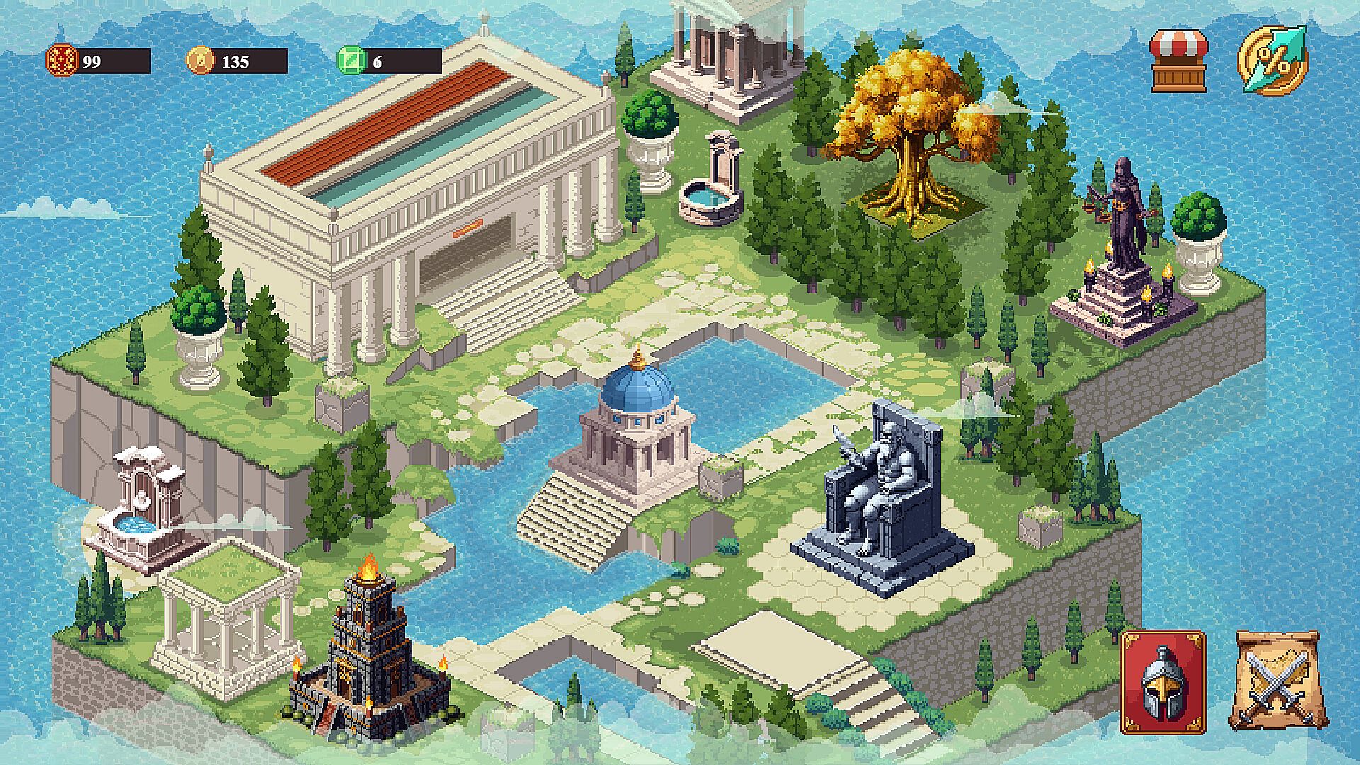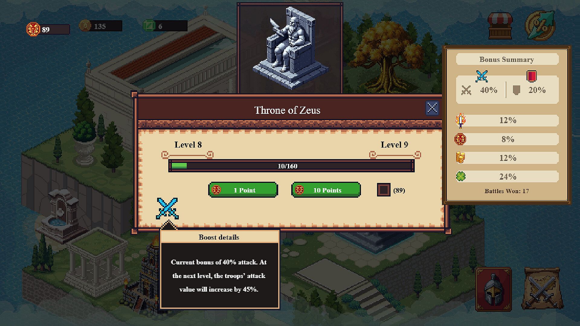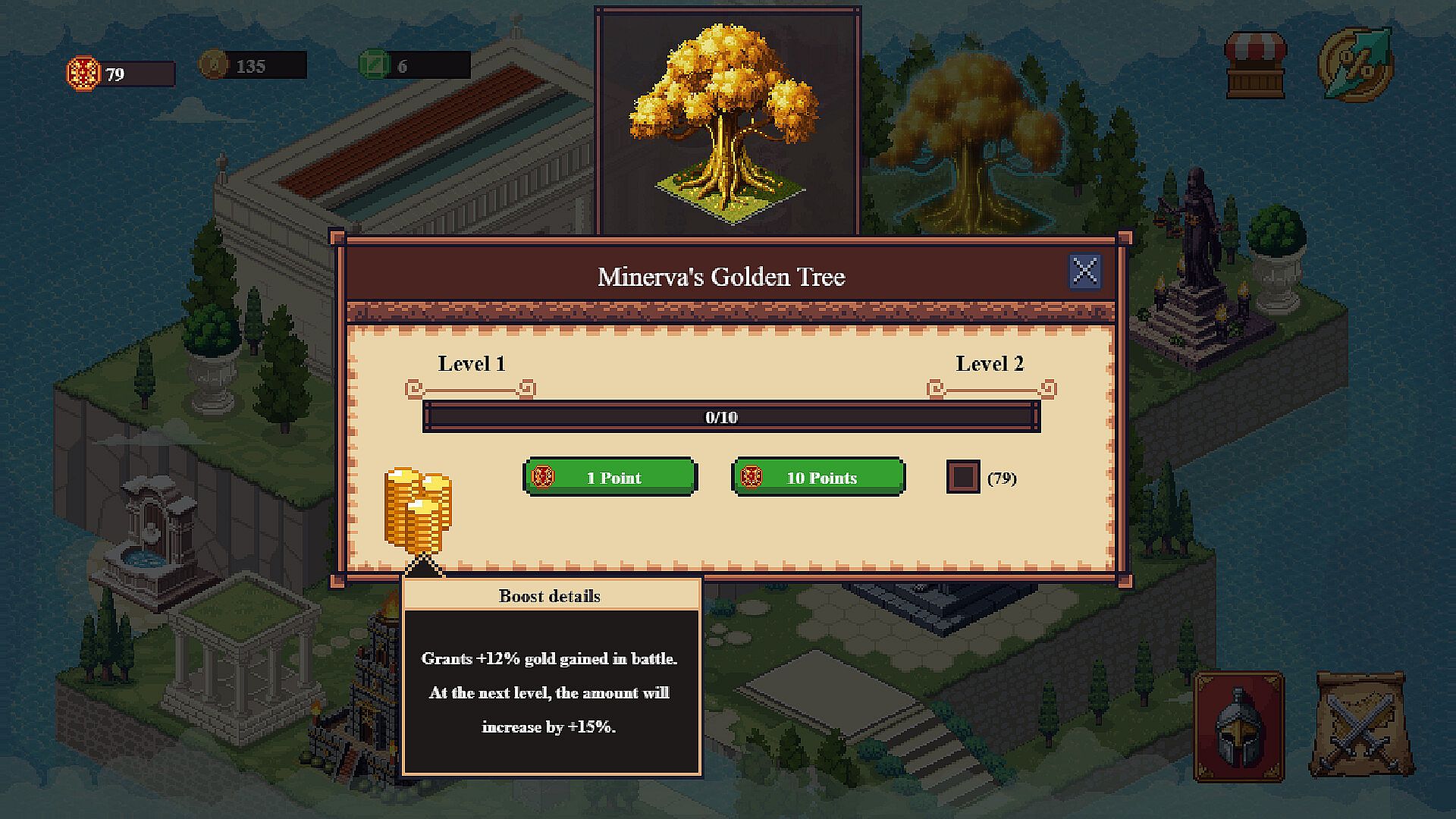 Use Victory Points to rebuild ancient structures that grant permanent strategic bonuses. Each restored monument strengthens your journey and shapes your playstyle. Level up to gain global bonuses and improvements such as: Attack, Defense, Critical Chance, Strategic Boosts, bonus coins, and extra resources.