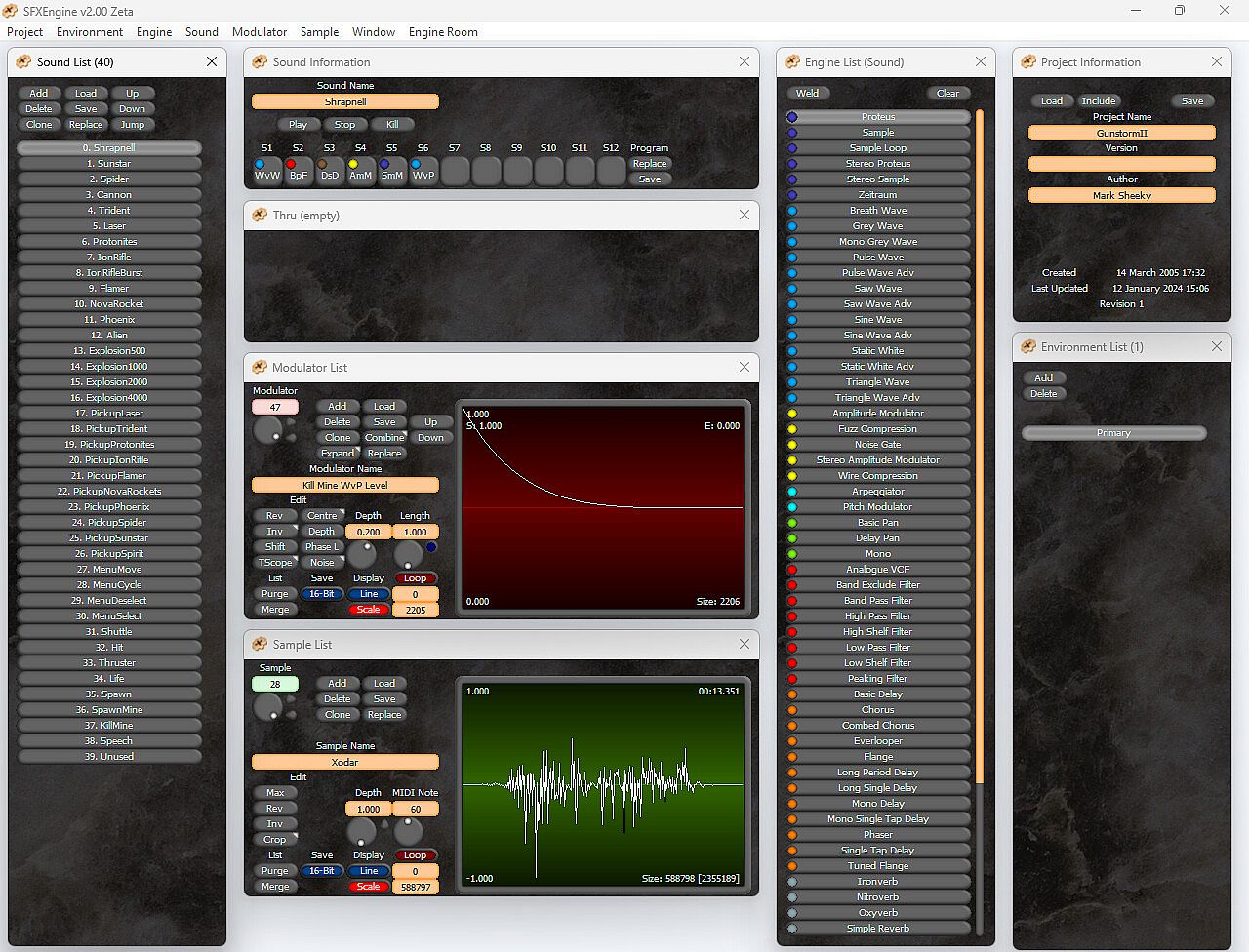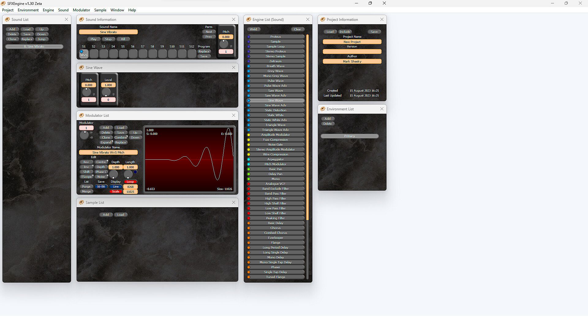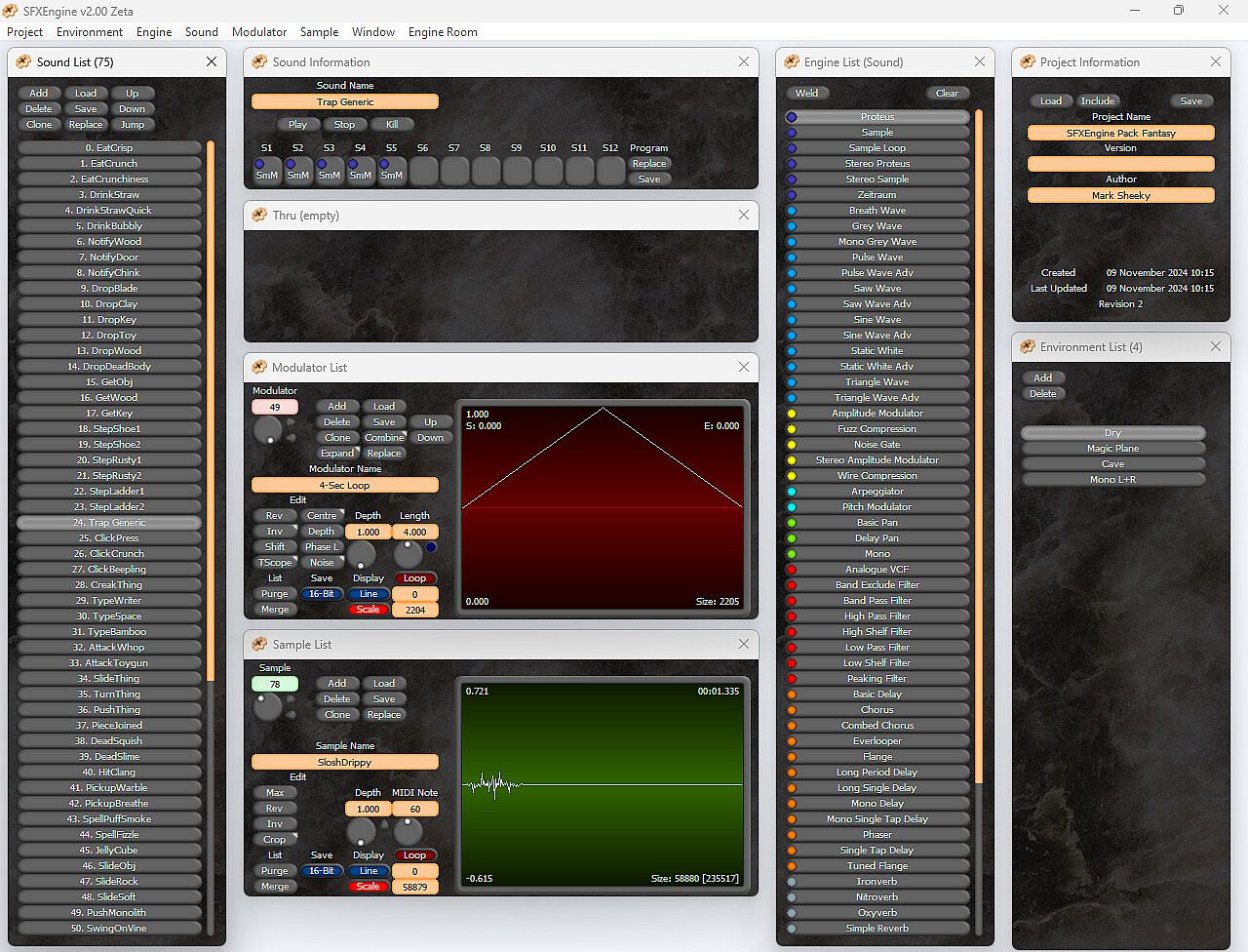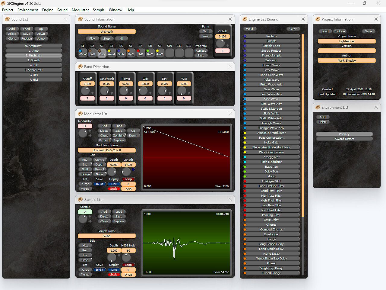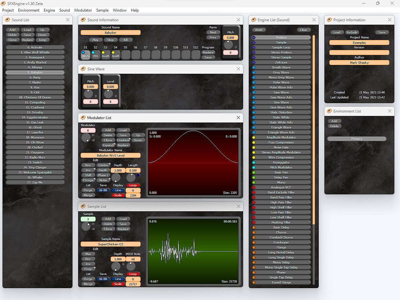 SFXEngine is powerful sound creation software for Windows PC's, one of the first software tools designed to for the creation of sound effects in a modular way. Using a plug-in based synthesis system, you can use SFXEngine to quickly and easily create any sound, or add new audio effects to existing sounds.