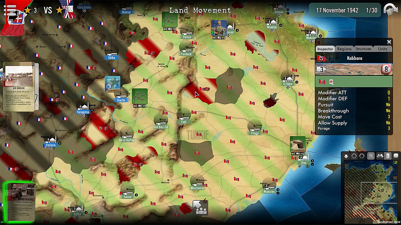Be careful of the potential weakness of some units, in particular the American land units, which are suffering from a lack of combat experience that the enemy can use. Watch your supply lines, but, above all, take control of key crossroads and choke points (such as the famous Kasserine Pass, or the Mareth Line). The try to cut the enemy in different sectors on which to concentrate overwhelming force.