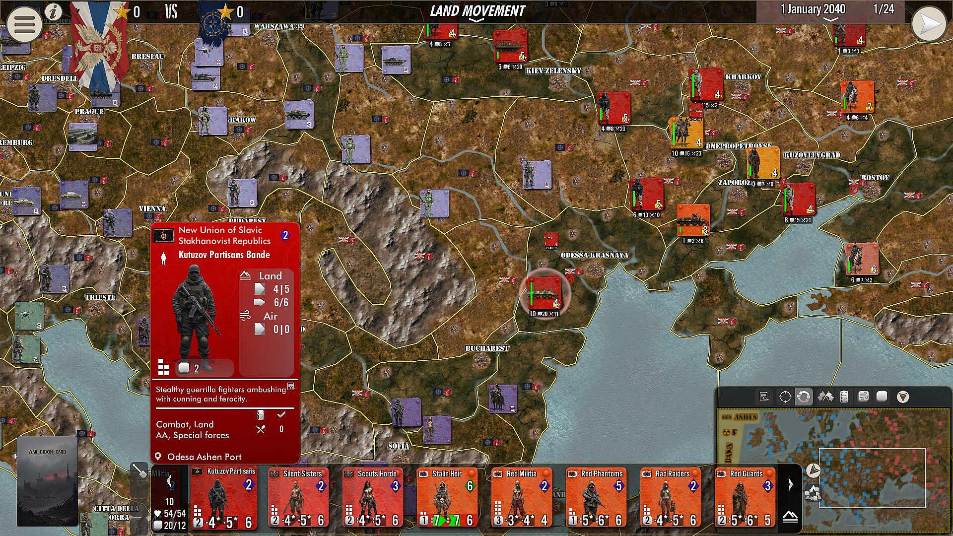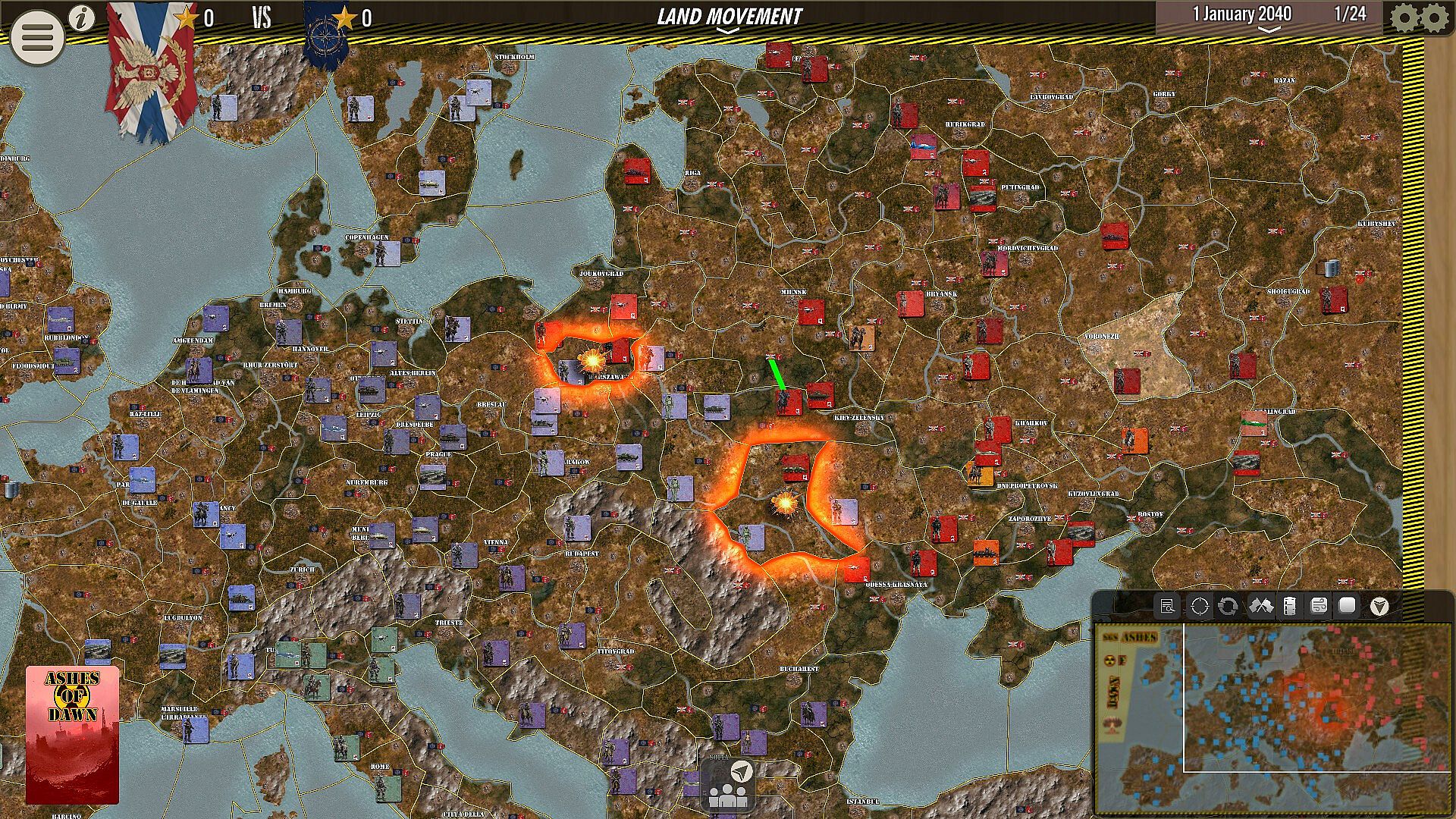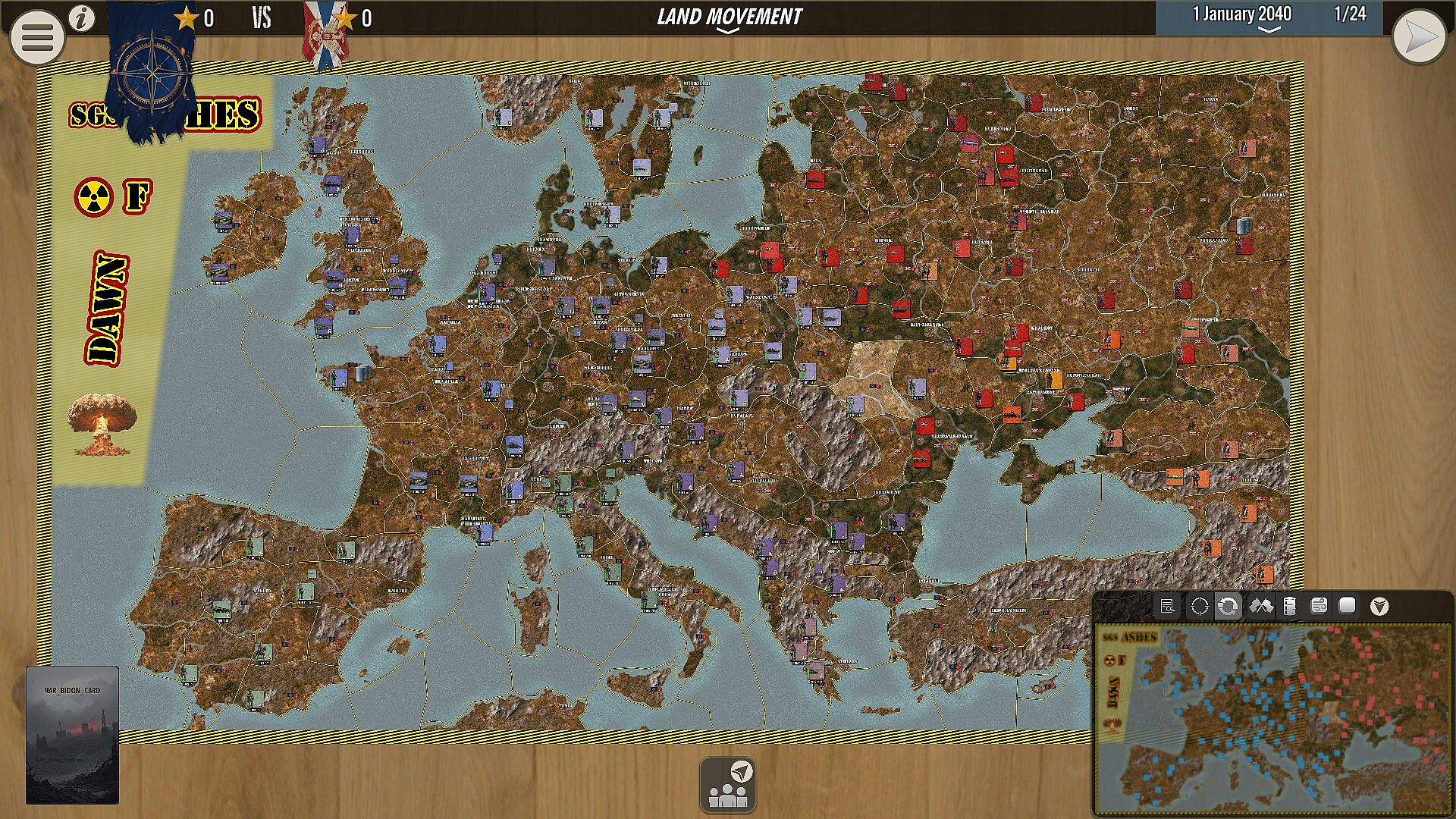 In May 2040, a window of opportunity opens: NARDO counterattacks to break VARPAC, while VARPAC invades the West to impose its empire. What if you were the leader of one of the two sides, one of the two major ideologies that survived the nuclear fire? Each turn—a month of brutal survival—can change everything: a failed raid, a mass desertion, or an unexpected event...