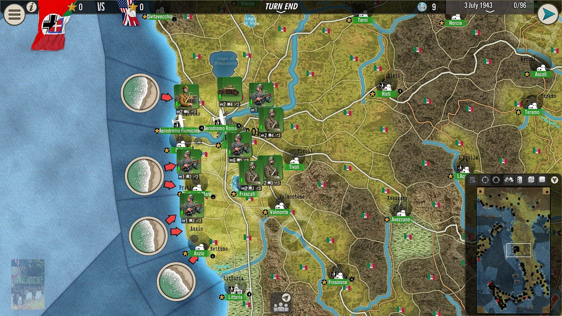 The Axis have very few good quality troops (mostly German) and almost no air superiority during most of the game, but bad weather, rugged terrain and a few reinforcements will permit them to mount a fighting retreat and defend key lines barring progression in the peninsula. During short periods of time, numbers, tactical and qualitative superiority will be present to create the basis of a safe stronghold, until overwhelming Allies superiority in the air or on land takes over. Time is your friend, responsiveness your best weapon.