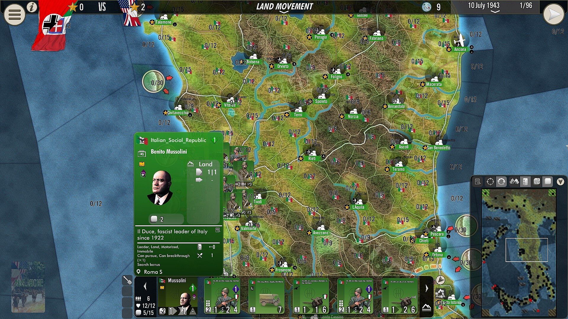 As the Axis commander in chief – i.e German Marshall Albert Kesselring fort the most part of the game -, your main goal is to gain time. With various German forces sent by Berlin over time and the royal Italian army (initially) then northern fascist forces from the Italian Social Republic, you must hold as long as possible onto every part of Italia, an arduous task which is rendered even more difficult after (and if) the Italian surrender. During the whole campaign, the more you delay the enemy, the more the “liberation mark” stay low and the higher your chances to keep the upper hand, and win. If the liberation count drop under zero, you win. If it reaches 100, you lose. As simple as that.
