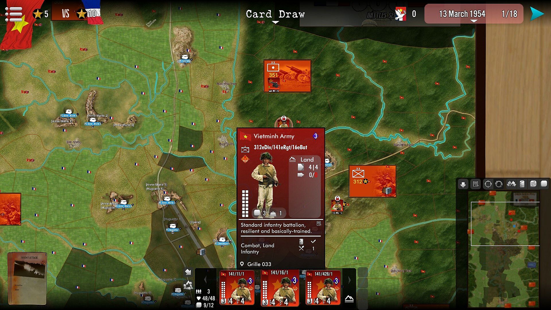 Favored Side/hardest to play : depending on the scenario played and in the campaign it can alternate, being harder for one side at one point in the game before becoming easier (and harder for the opposing side). French are on the defensive (but still can make some counter-attacks, or harass VM supply lines), while the brunt of the assault and conquest bear on the Vietminh.
