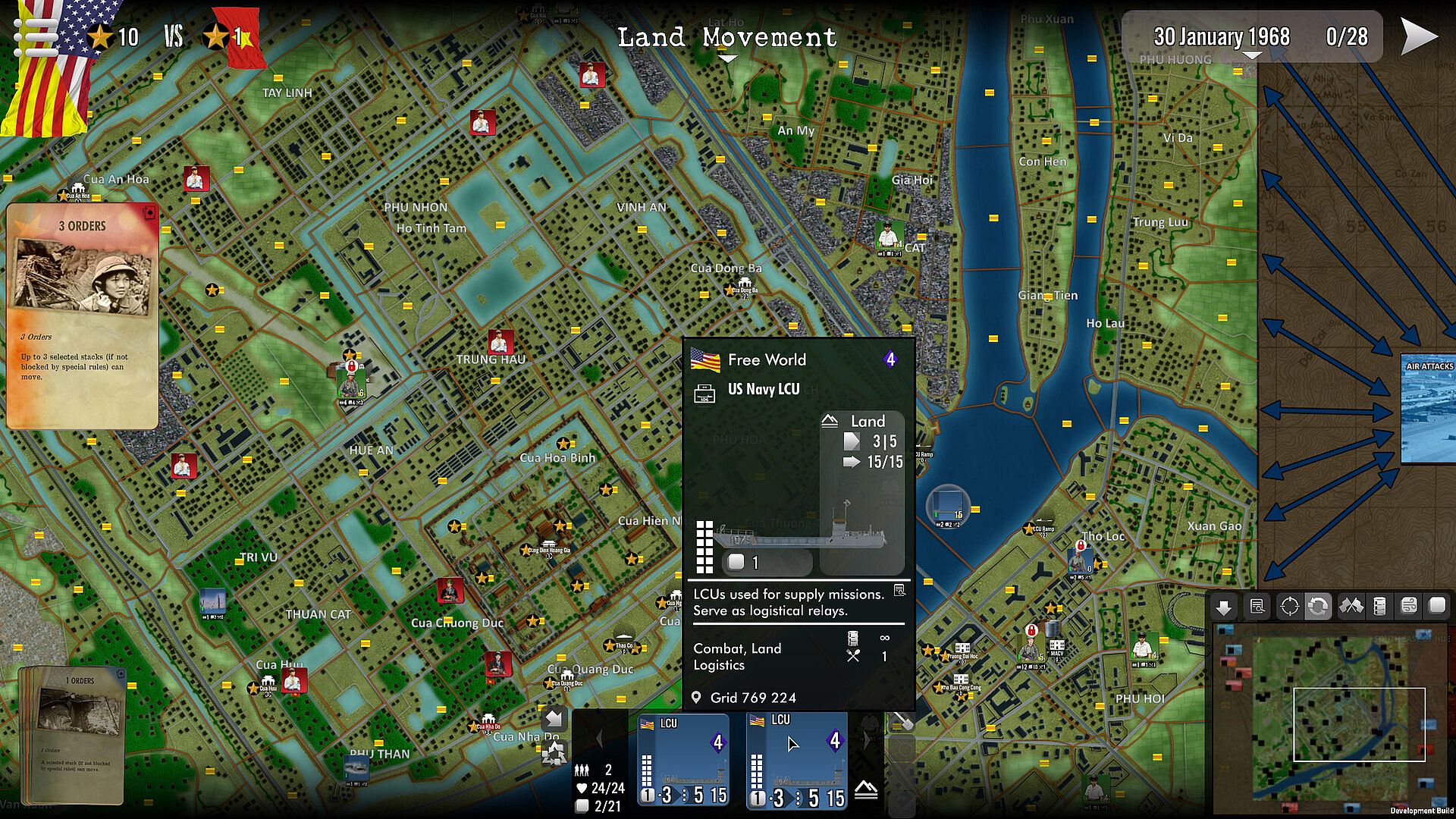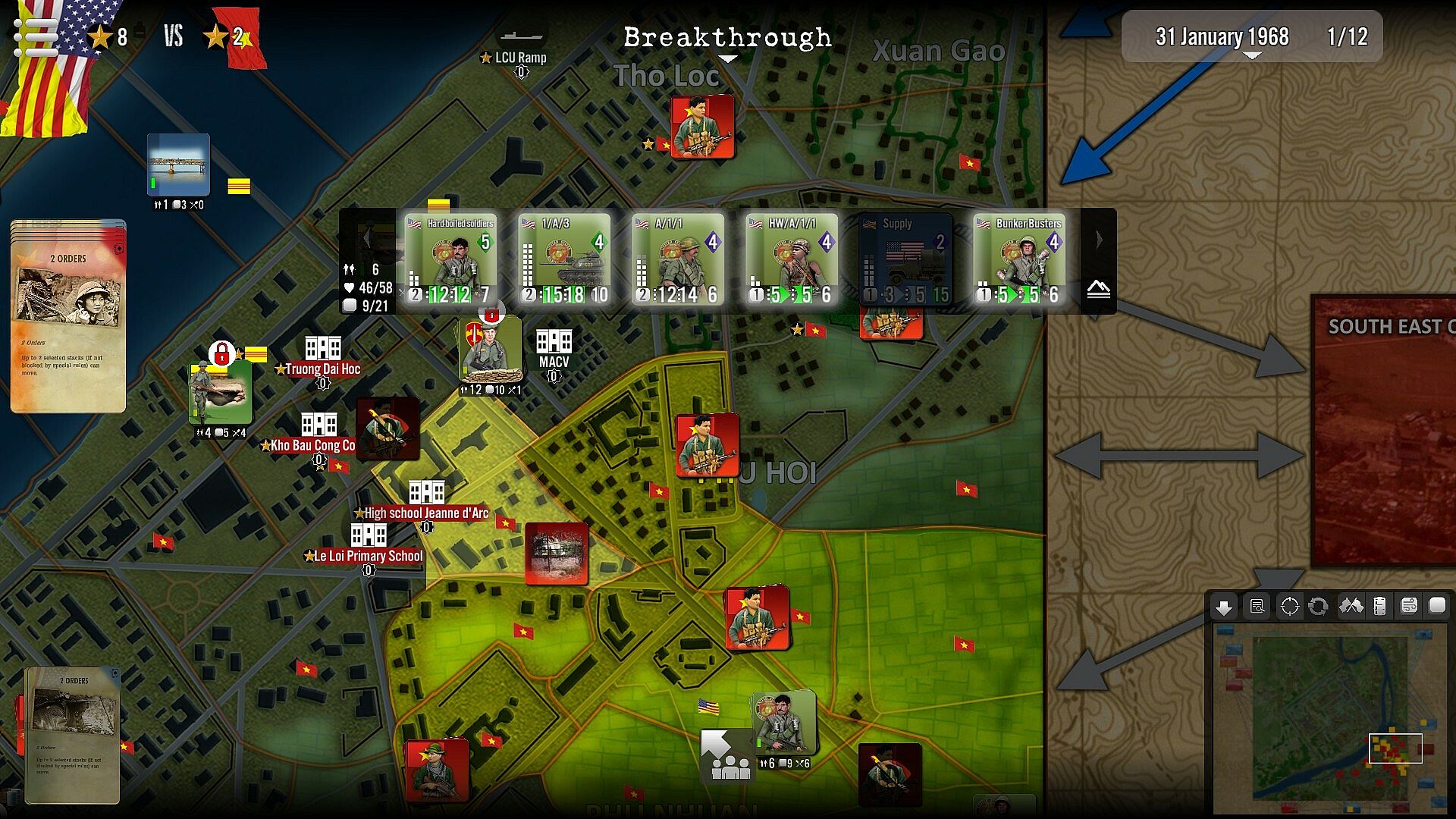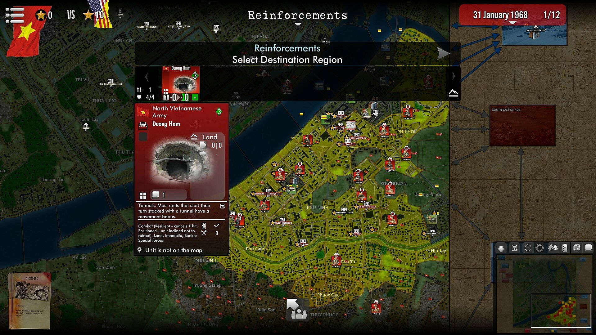 In the campaign scenario, the Communist player must seize as many sectors of Hué and the surrounding area as possible (to ensure the supply and reinforcement of units in the city's districts), then hold them for as long as possible. The longer the North Vietnamese/Vietnamese-Cong player holds on with symbolic points, the greater his chances of victory.