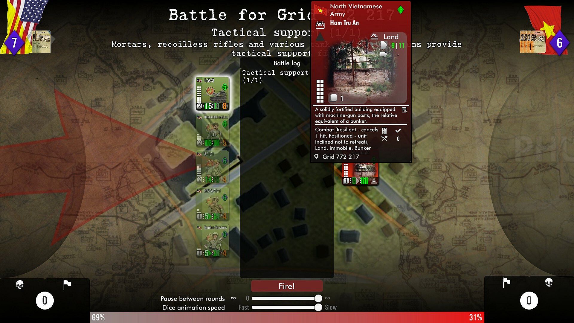 Players have to balance their strengths and weaknesses, with the added constraints of complex terrain to tackle: dense urban areas, military installations, villages, rice paddies... Each of these terrains has its own modifiers (influencing movement and combat) which can make offensive operations particularly tricky unless actions are organized by combining the strengths of the units involved.