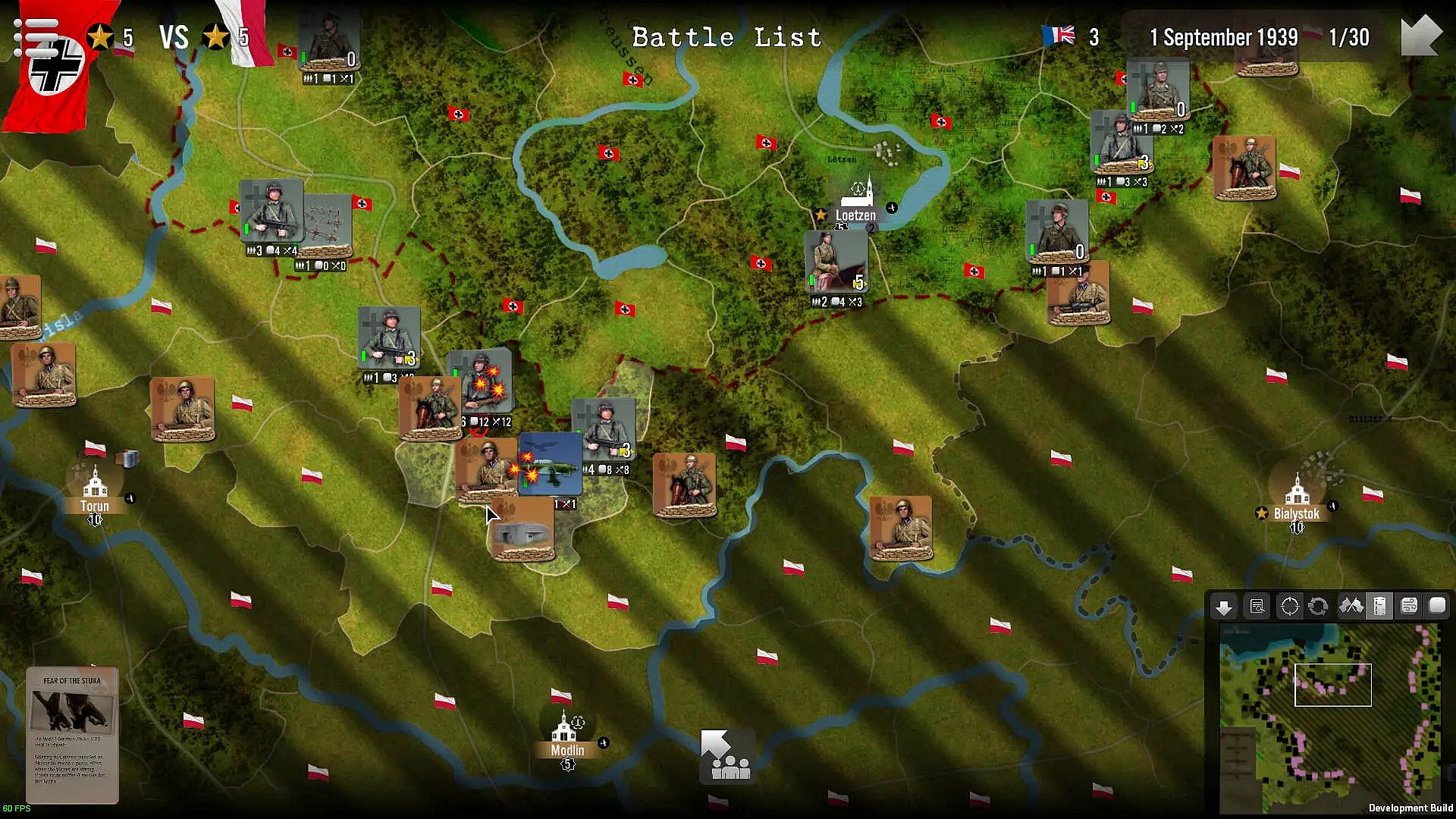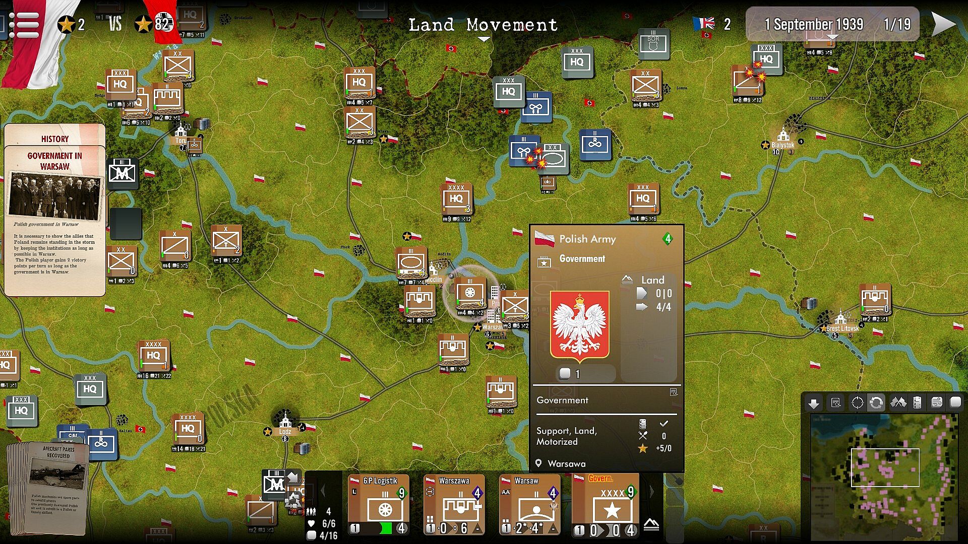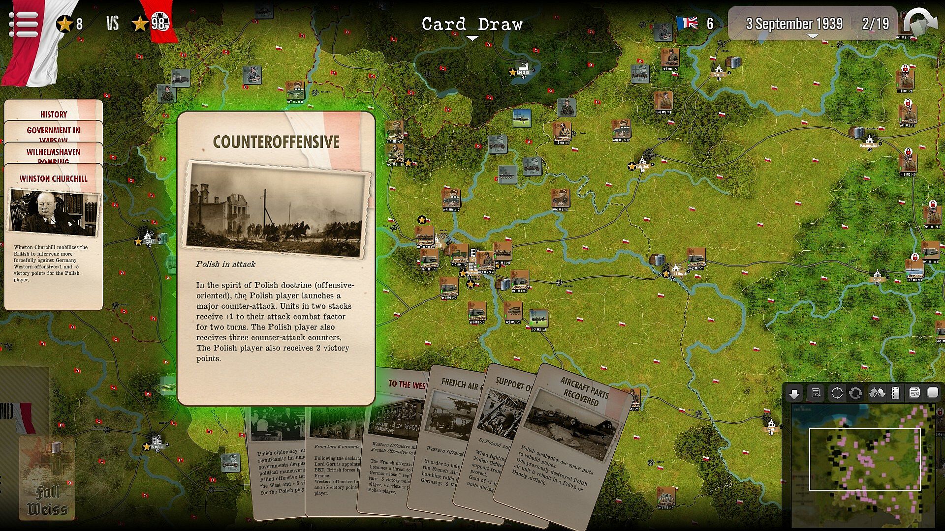 To ensure rapid success while limiting losses, the attacking player must make balanced use of air support, armoured units, artillery and regular infantry, taking into account the effects of the terrain (woods, forests, rivers, etc.). He also has to deal with the cards in his hand, which simulate perfectly successful tactical or operational actions or events with a strategic dimension: from the bonuses brought about by the increasing use of Pervitin within German units to the increase in Polish replacements induced by popular support.