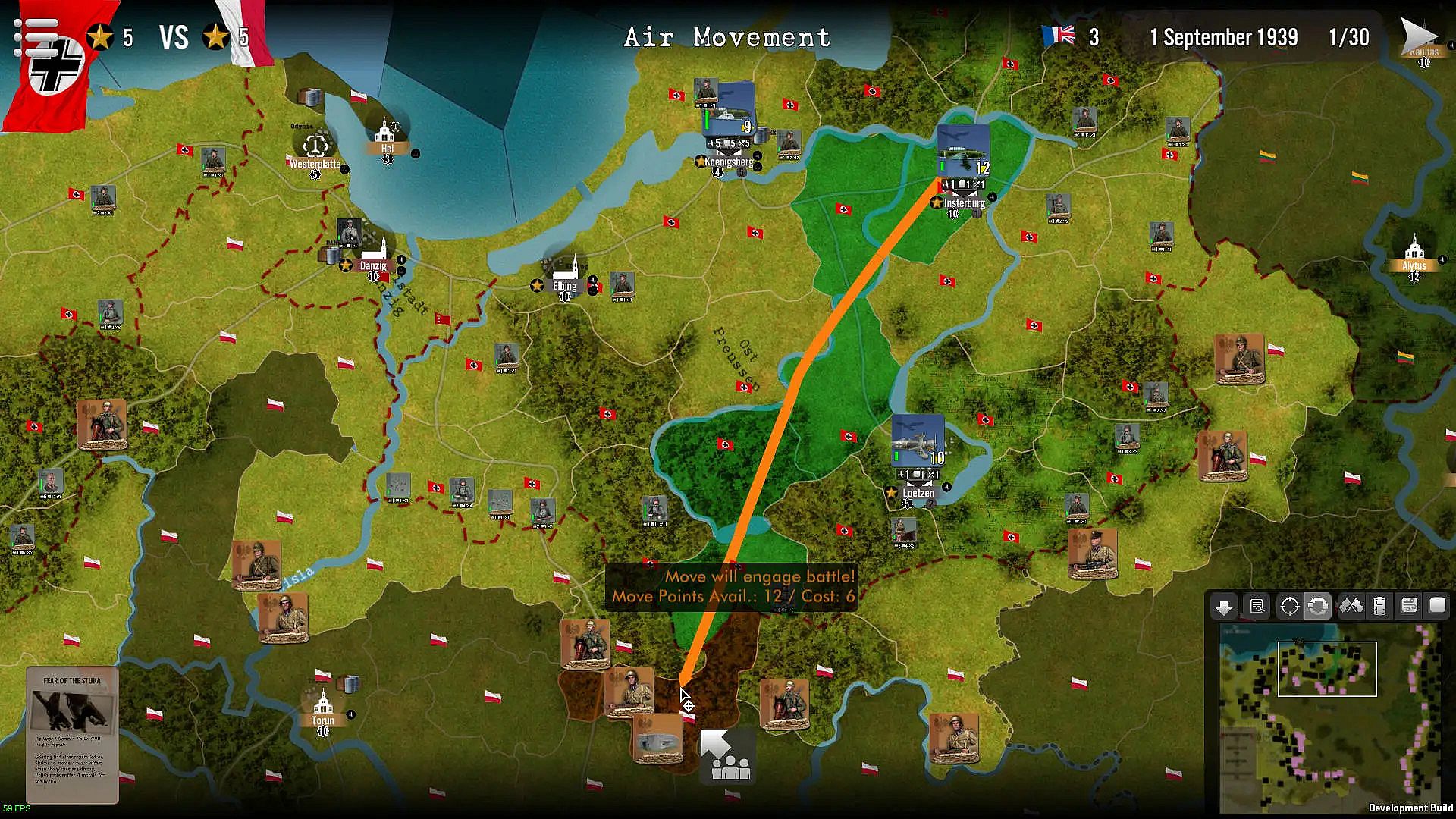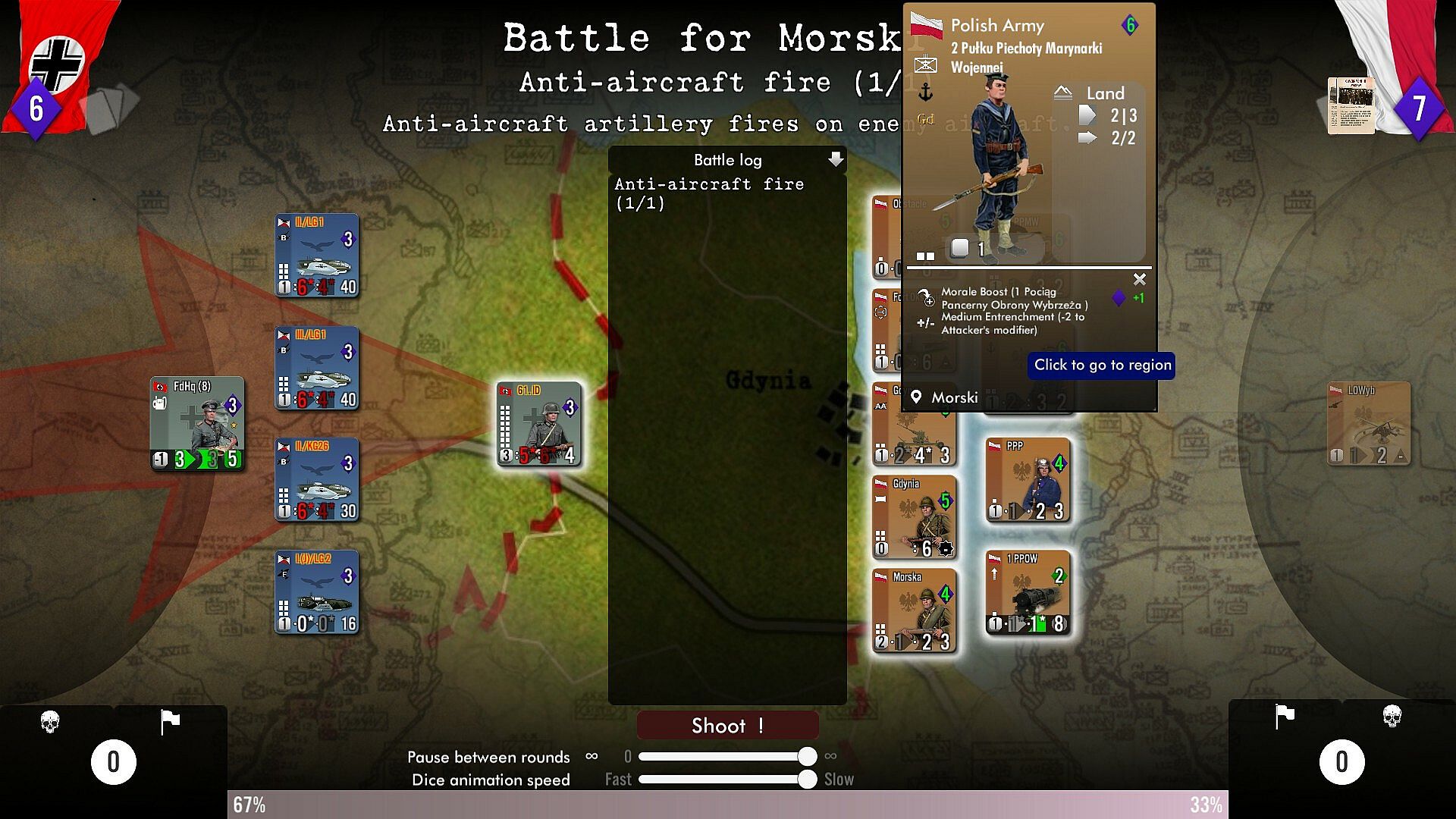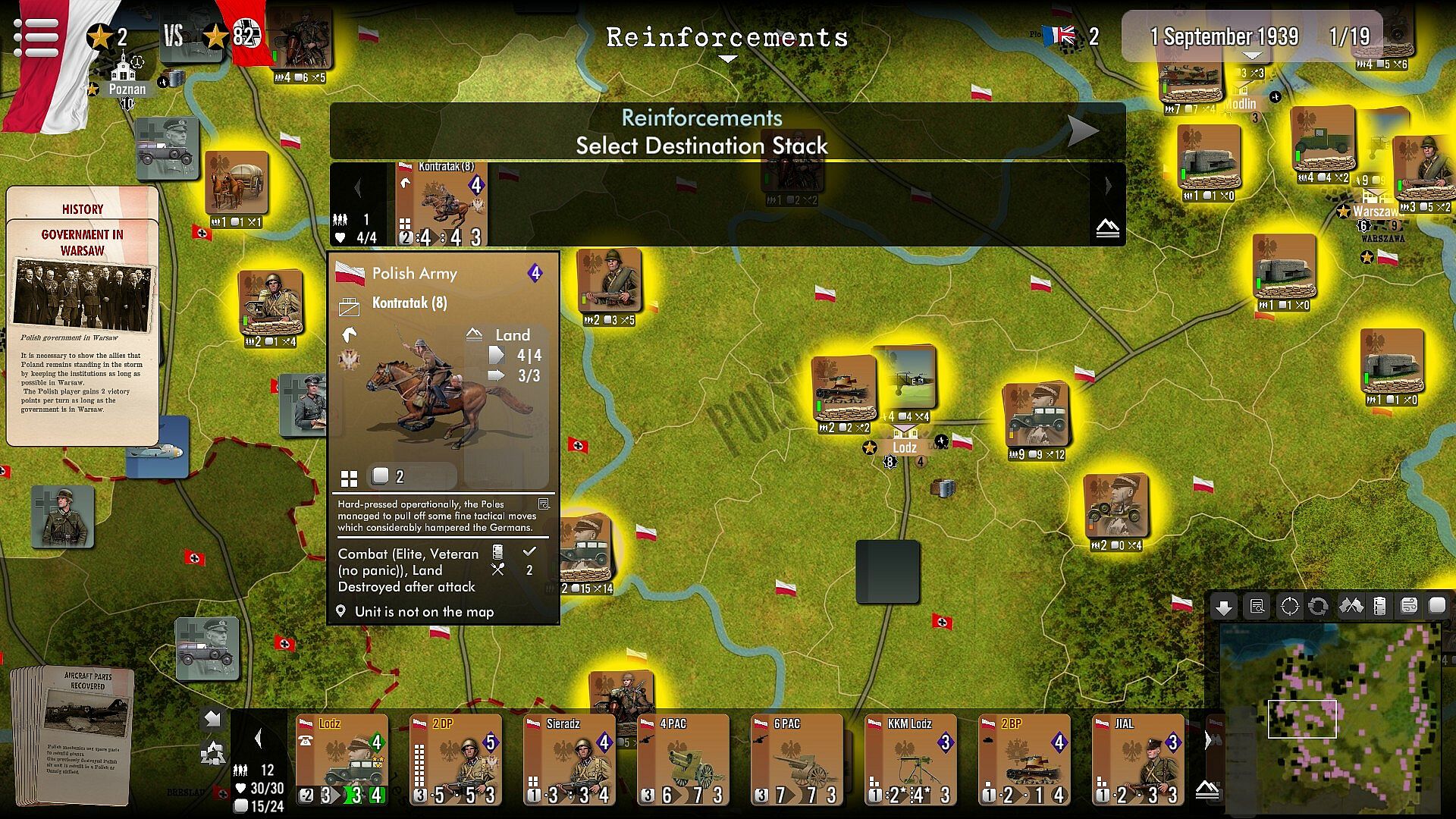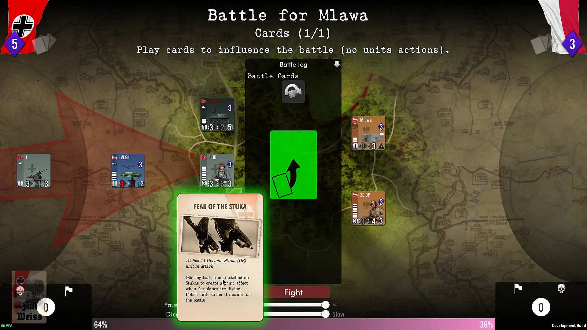 To ensure rapid success while limiting losses, the attacking player must make balanced use of air support, armoured units, artillery and regular infantry, taking into account the effects of the terrain (woods, forests, rivers, etc.). He also has to deal with the cards in his hand, which simulate perfectly successful tactical or operational actions or events with a strategic dimension: from the bonuses brought about by the increasing use of Pervitin within German units to the increase in Polish replacements induced by popular support.