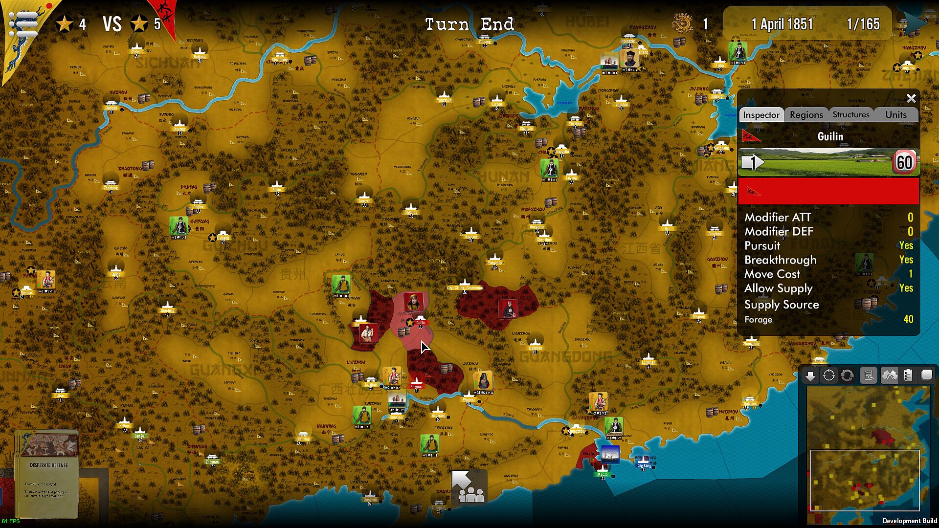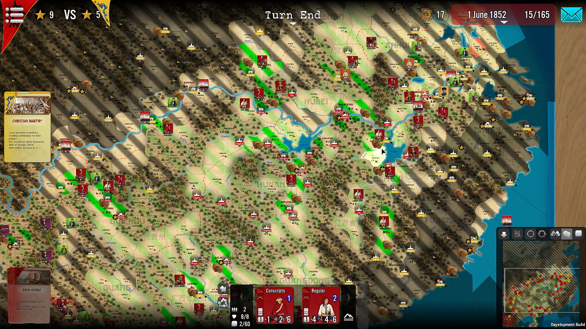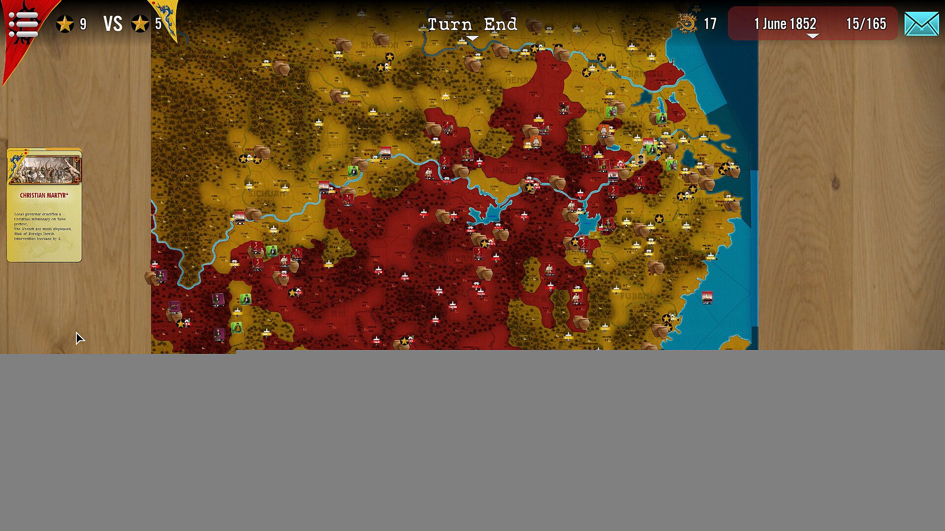 • The Qings are unprepared for the rebellion and consider it a minor incident in remote areas of their huge empire. They must take conscience of the stakes as quickly as possible, before the enemy becomes too powerful and unstoppable. Troops are weak and spread out, leadership bad. Training of new forces, purchasing better weapons and hiring the right leaders is required, but this can only come when the Emperor realizes the situation (via the Qing’s Imperial Concern index).