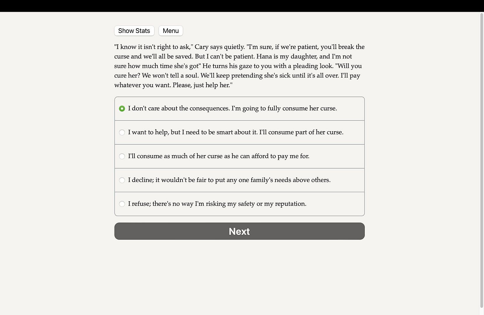 Shadow of the Curse-Eater is an interactive novel by Kim Berkley. It’s entirely text-based, without graphics or sound effects, and fueled by the vast, unstoppable power of your imagination.
