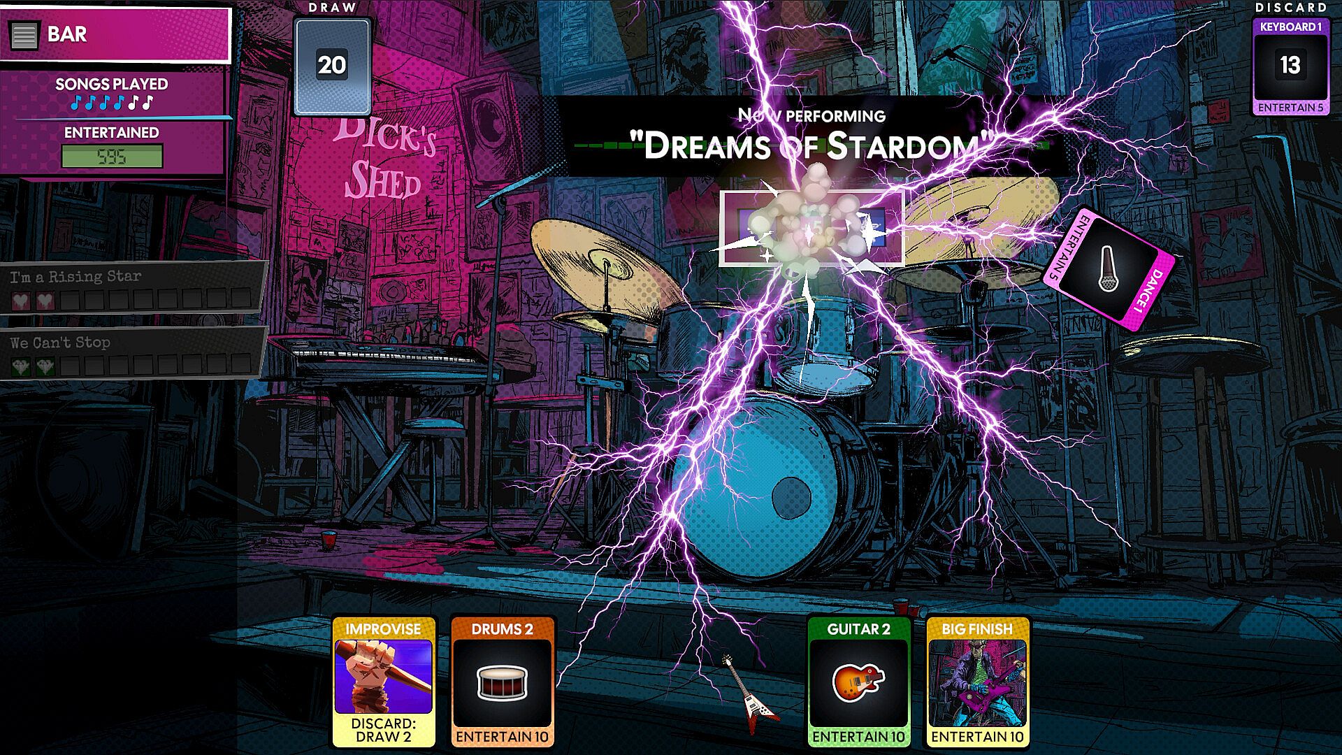 Various card types, collectibles, and consumables to manipulate gigs on the fly and maximize your audience scores.