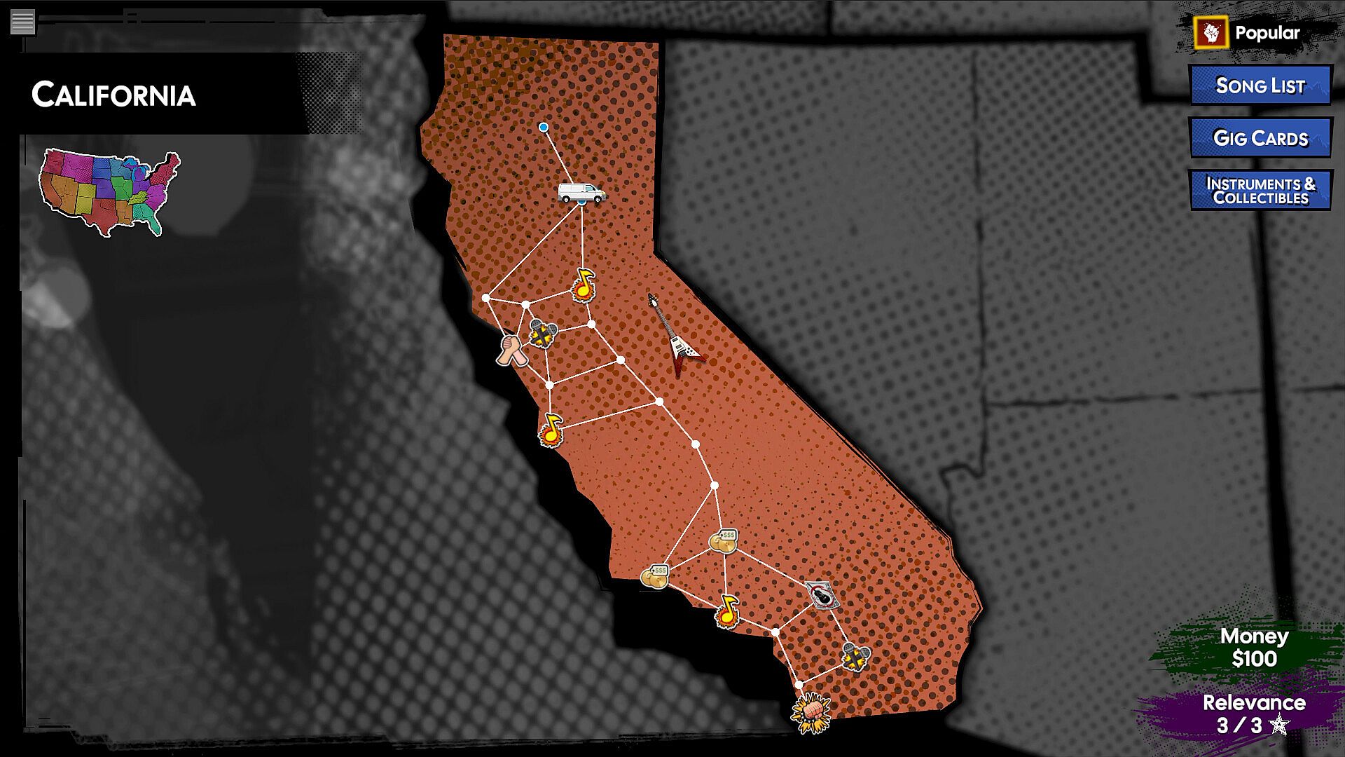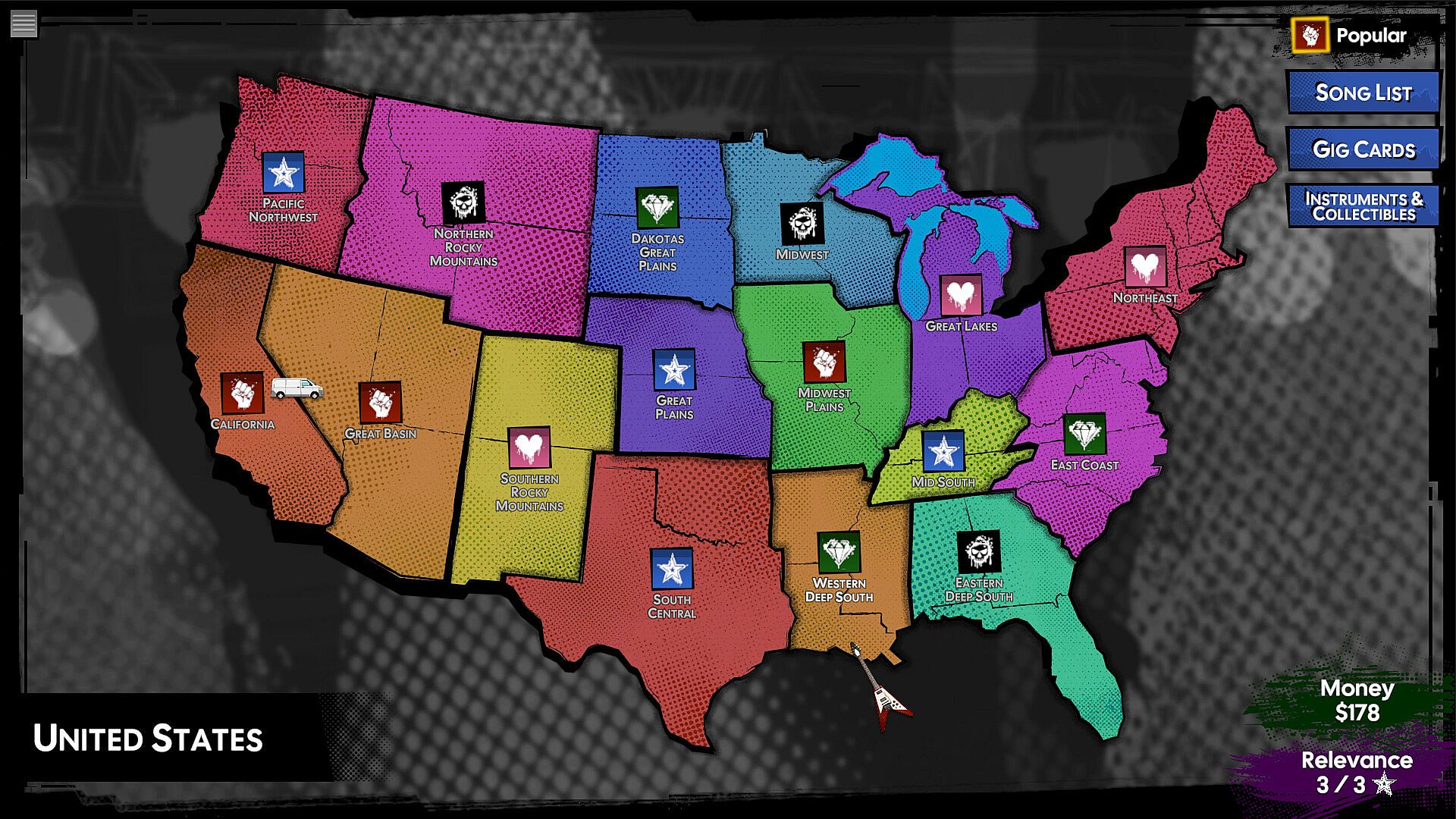 Gameplay focuses on playing gigs during a U.S. tour. To progress you must beat bosses in battle of the bands. Beat the final boss to achieve ultimate victory, but it won't be easy. Don't be discouraged if you fail - it's all part of the journey.