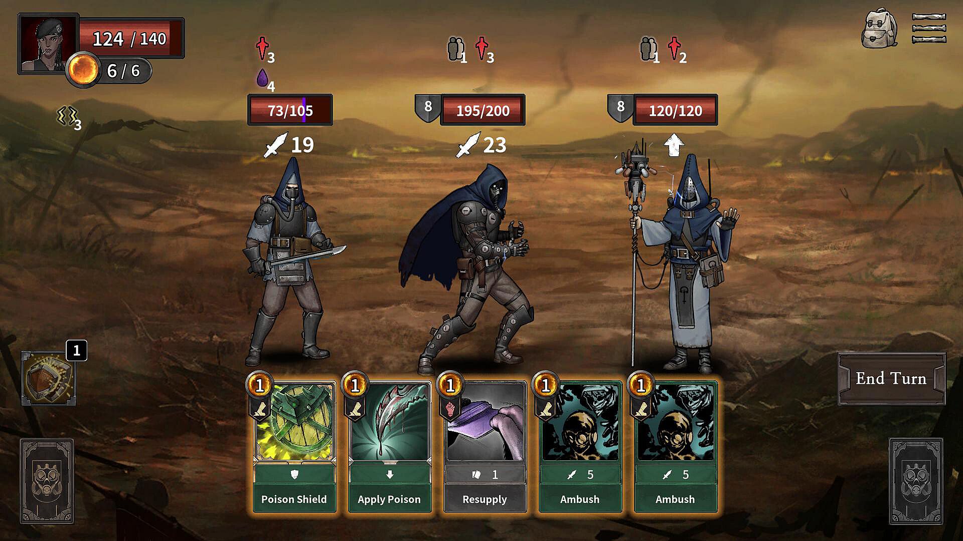 When you encounters combat, turn-based card deck battle begins. Engage in strategic combat by using skills and cards to attack and defend against enemies.