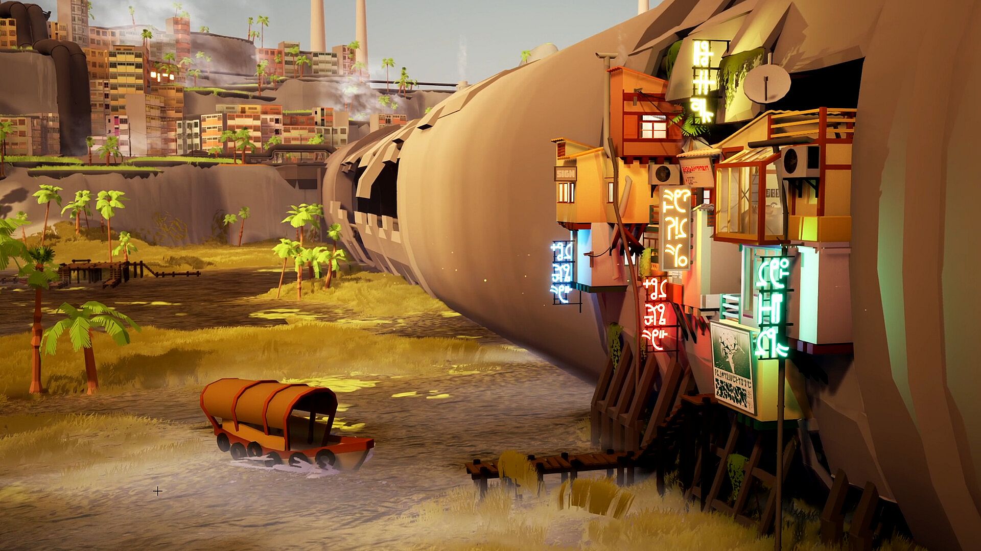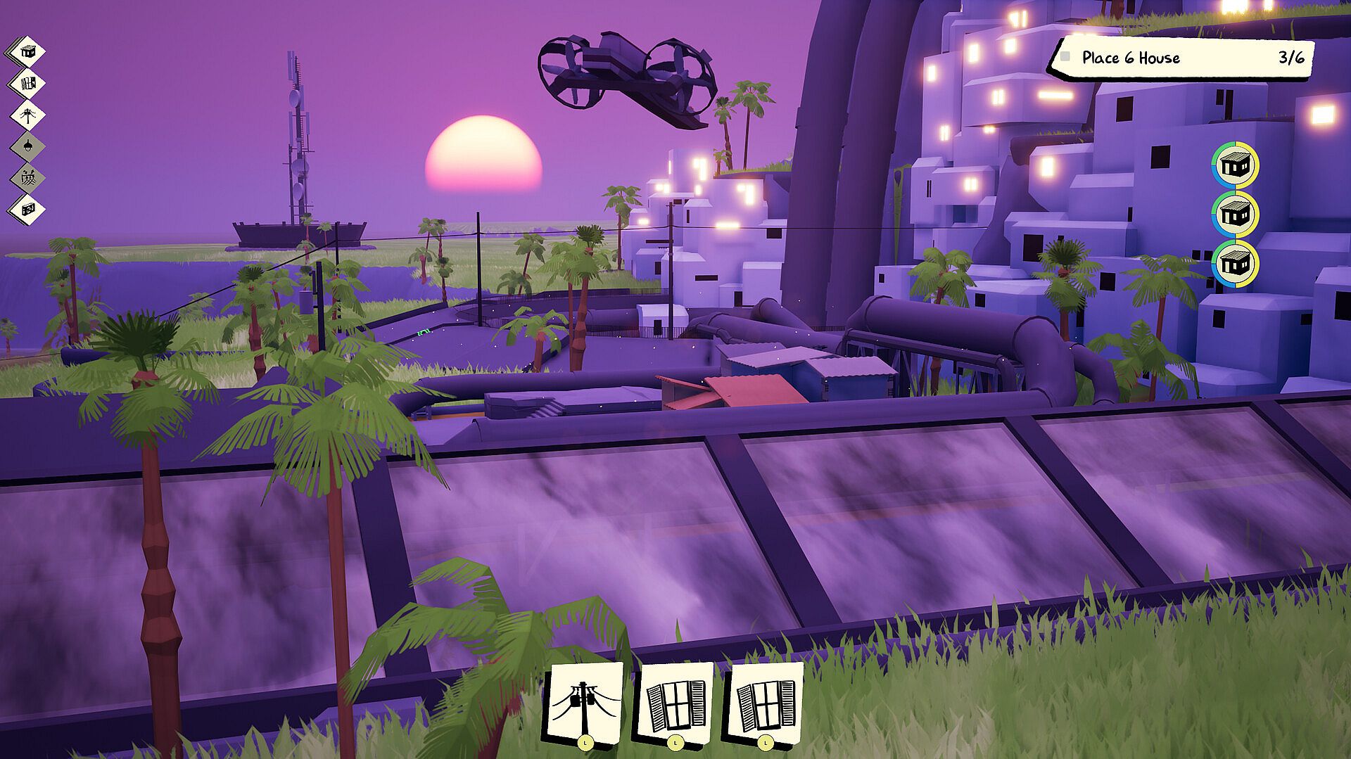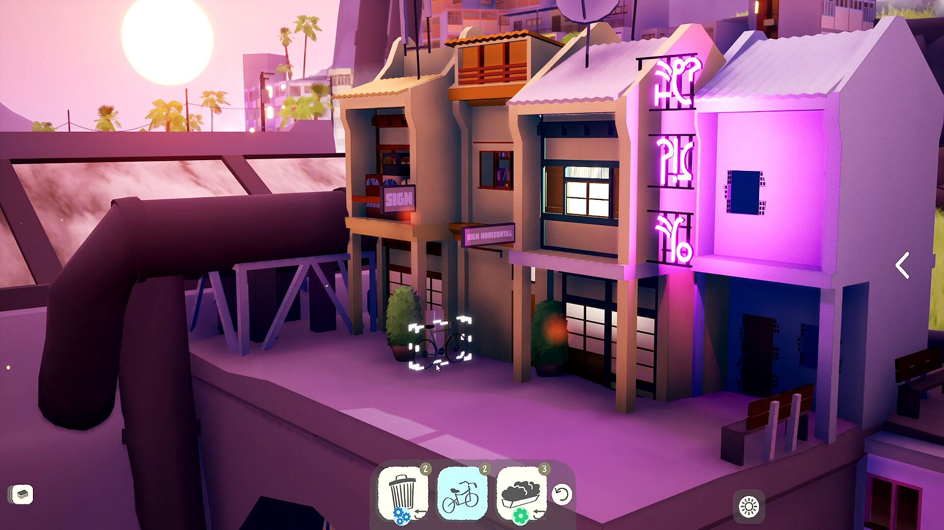 Each location presents a unique set of objects and a limited space to build within. Whether it’s food trucks, neon signs, or industrial smokestacks, players must carefully fit everything together to create a dense, living space that feels right.