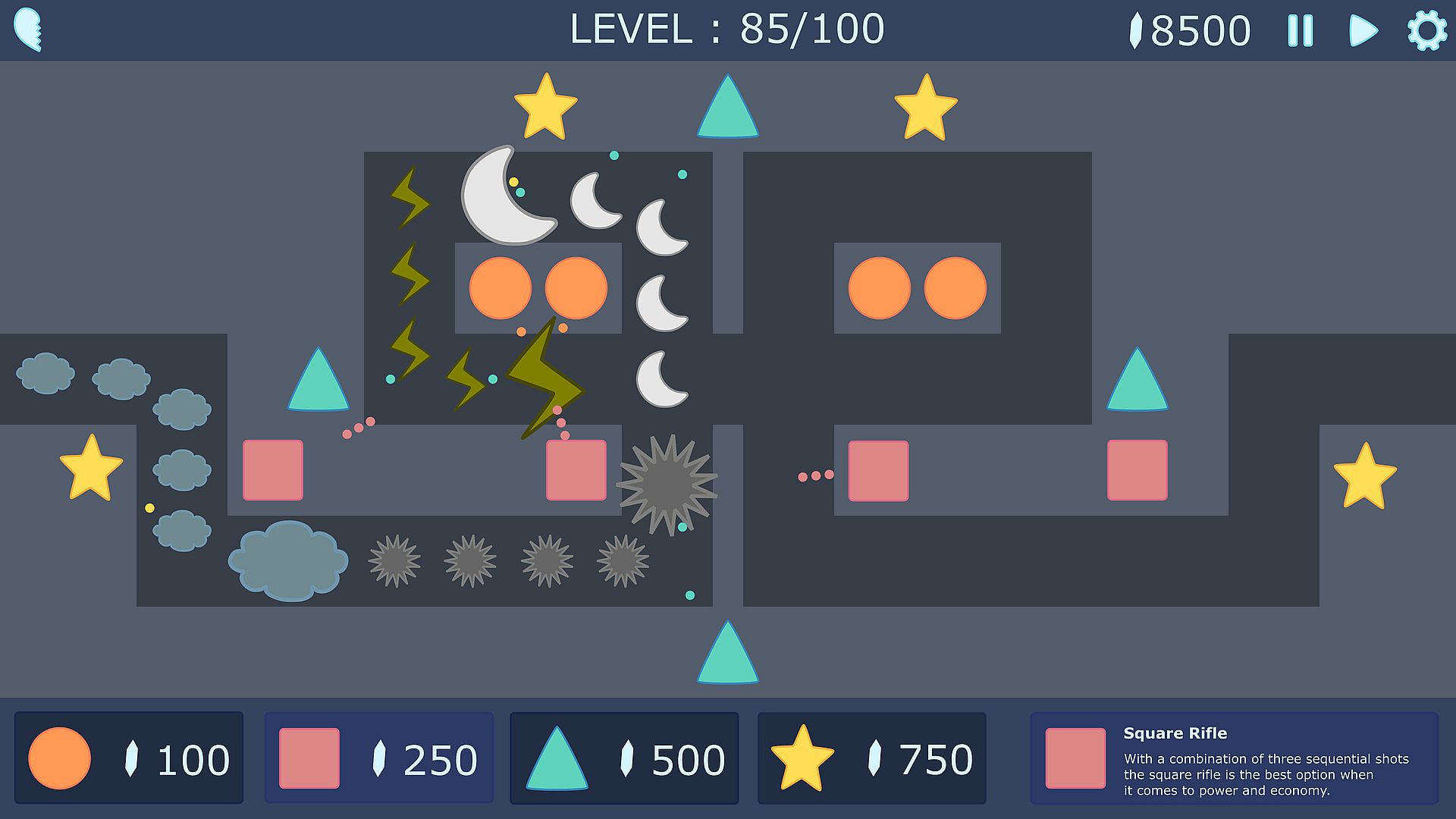 In this Tower Defense, you will be the leader of the Symmetrical Order, a group of geometric shapes that seek simplicity and cohesion in their layouts, and for that, they will defend their way of thinking fighting the Asymmetric Gang.