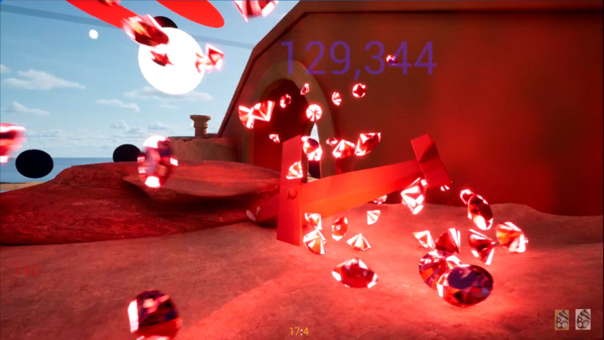 If you come in contact with an ENEMY or HAZARDS like DEEP WATER, the round is over and you are transported to THE ROOM, where you can see your SCORE and FINAL TIME, the TROPHIES you've collected and any BONUS AWARDS you have earned.  Then you can try it all over again!